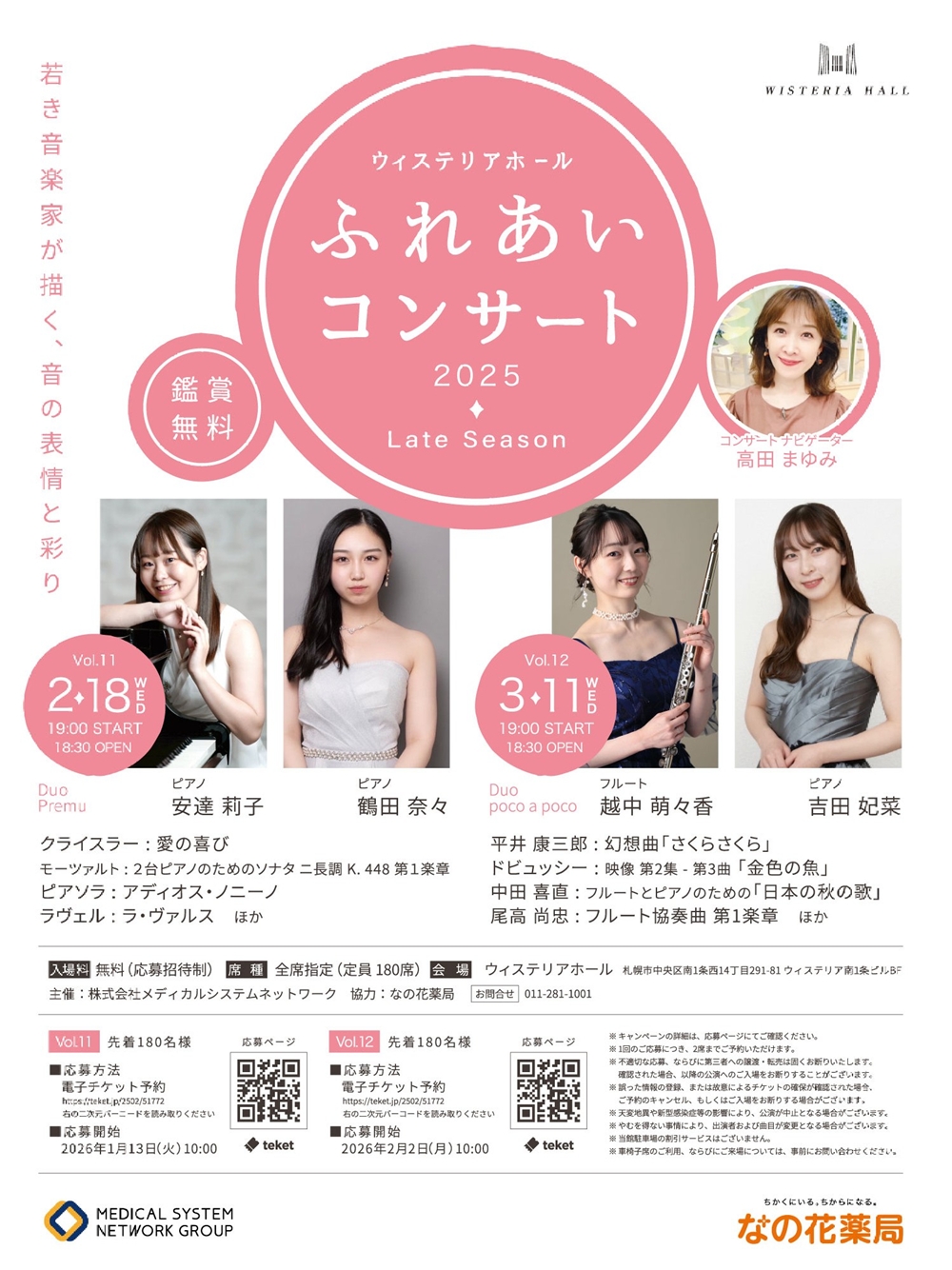 ウィステリアホールふれあいコンサートVol.11 2月18日(水)19:00 ウィステリアホール(札幌市中央区南1条西14丁目291-81ウィステリア南1条ビルBF) 出演 ピアノ/鶴田 奈々(ハイメスアーティスト) ピアノ/安達 莉子(ハイメスアーティスト) コンサートナビゲーター/高田まゆみ(HTBレポーター) 曲名 クライスラー/愛の喜び モーツァルト/2台ピアノのためのソナタ ニ長調K.448 第1楽章 ピアソラ/アディオス・ノニーノ ラヴェル/ラ・ヴァルス ‥‥ほか |