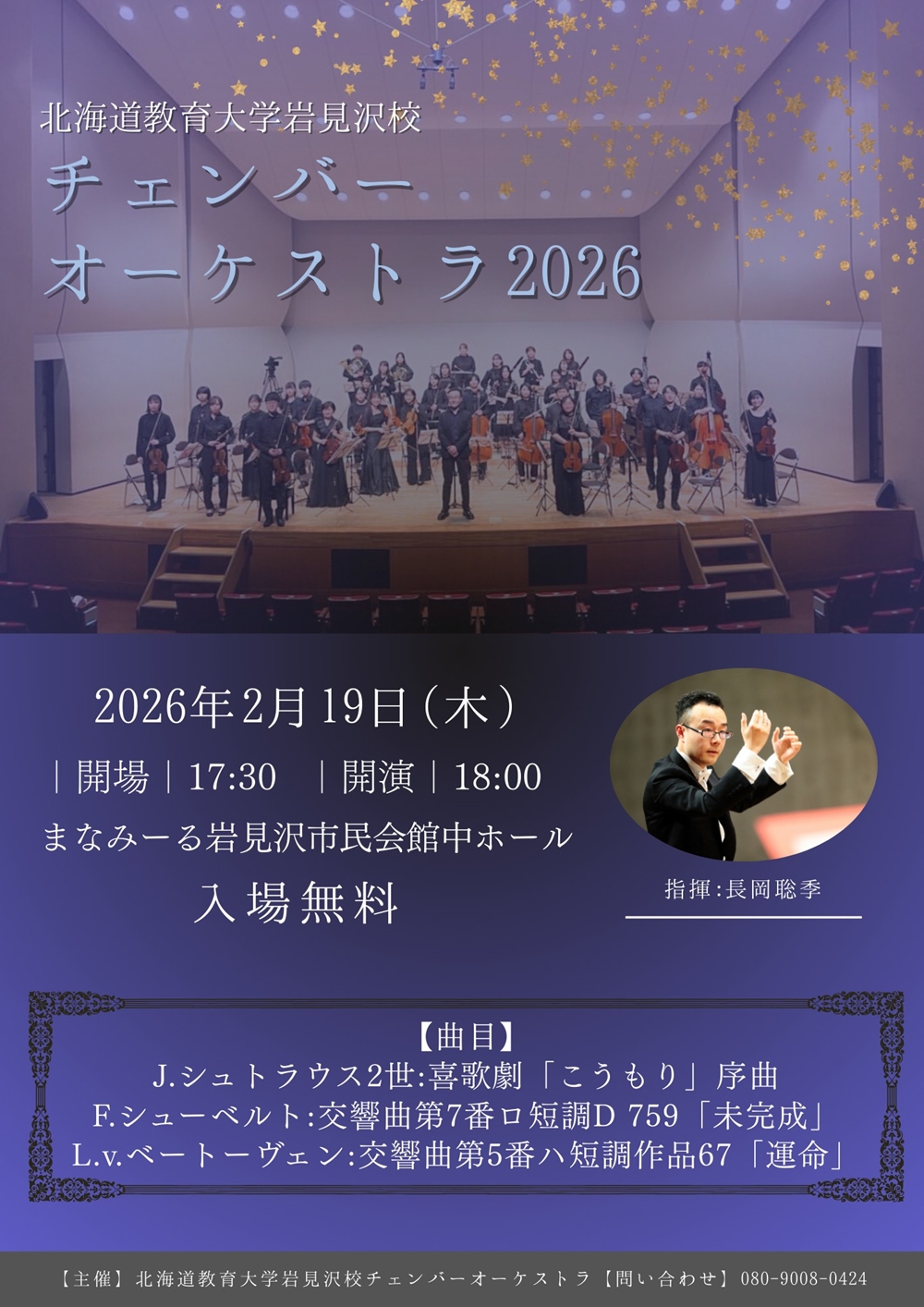 北海道教育大学岩見沢校チェンバー・オーケストラ2026 2月19日(木)18:00 まなみーる岩見沢市民会館・岩見沢市文化センター中ホール(岩見沢市9条西4丁目1-1) 出演 指揮/長岡 聰季(北海道教育大学岩見沢校音楽文化専攻准教授) 管弦楽/北海道教育大学岩見沢校チェンバー・オーケストラ 曲目 J.シュトラウス2世/喜歌劇「こうもり」序曲 F.シューベルト/交響曲第7番ロ短調D759「未完成」 L.v.ベートーヴェン/交響曲第5番ハ短調作品67「運命」 |
