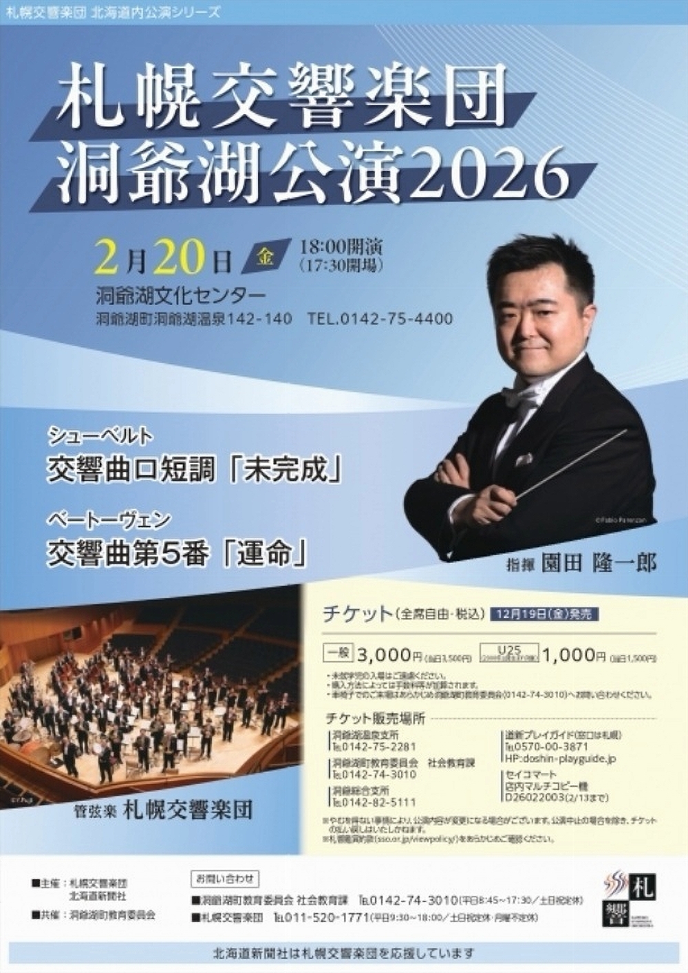 札幌交響楽団北海道内公演シリーズ札幌交響楽団 洞爺湖公演2026 2月20日(金)18:00 洞爺湖文化センター(虻田郡洞爺湖町洞爺湖温泉142-130) 出演 指揮/園田隆一郎(パシフィックフィルハーモニア東京) 管弦楽/札幌交響楽団 曲目 シューベルト/交響曲ロ短調「未完成」 ベートーヴェン/交響曲第5番「運命」 |