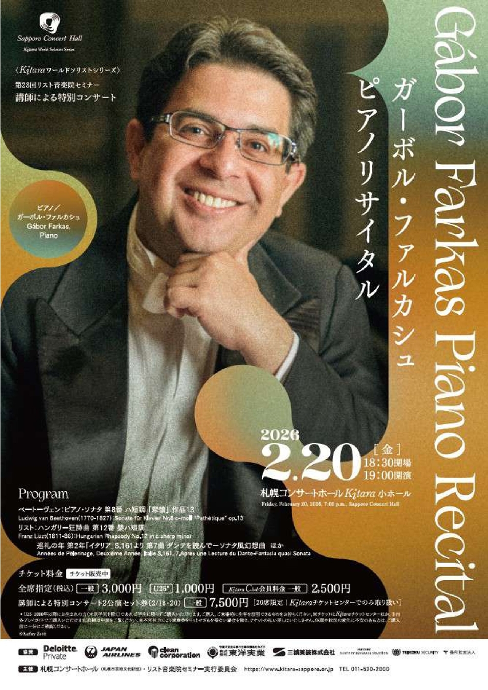 Kitaraワールドソリストシリーズ第28回リスト音楽院セミナー 講師による特別コンサート ガーボル・ファルカシュ ピアノリサイタル 2月20日(水)19:00 札幌コンサートホールKitar小ホール 出演 ピアノ/ガーボル・ファルカシュ(リスト音楽院学長) プログラム ベートーヴェン/創作主題による32の変奏曲ハ短調WoO 80 ベートーヴェン/ピアノ・ソナタ第8番ハ短調「悲愴」作品13 ベートーヴェン/ロンド・ア・カプリチョト長調「失われた小銭への怒り」作品129 リスト/巡礼の年第2年『イタリア』S.161より第1曲「婚礼」、第2曲「物思いに沈む人」 リスト/巡礼の年第3年S.163より第4曲「エステ荘御噴水」 リスト/ハンガリー狂詩曲第12番嬰ハ短調 リスト/アヴェ・マリアS.182 リスト/巡礼の年第2年『イタリア』S.161より第7曲「ダンテを読んで-ソナタ風幻想曲」 |