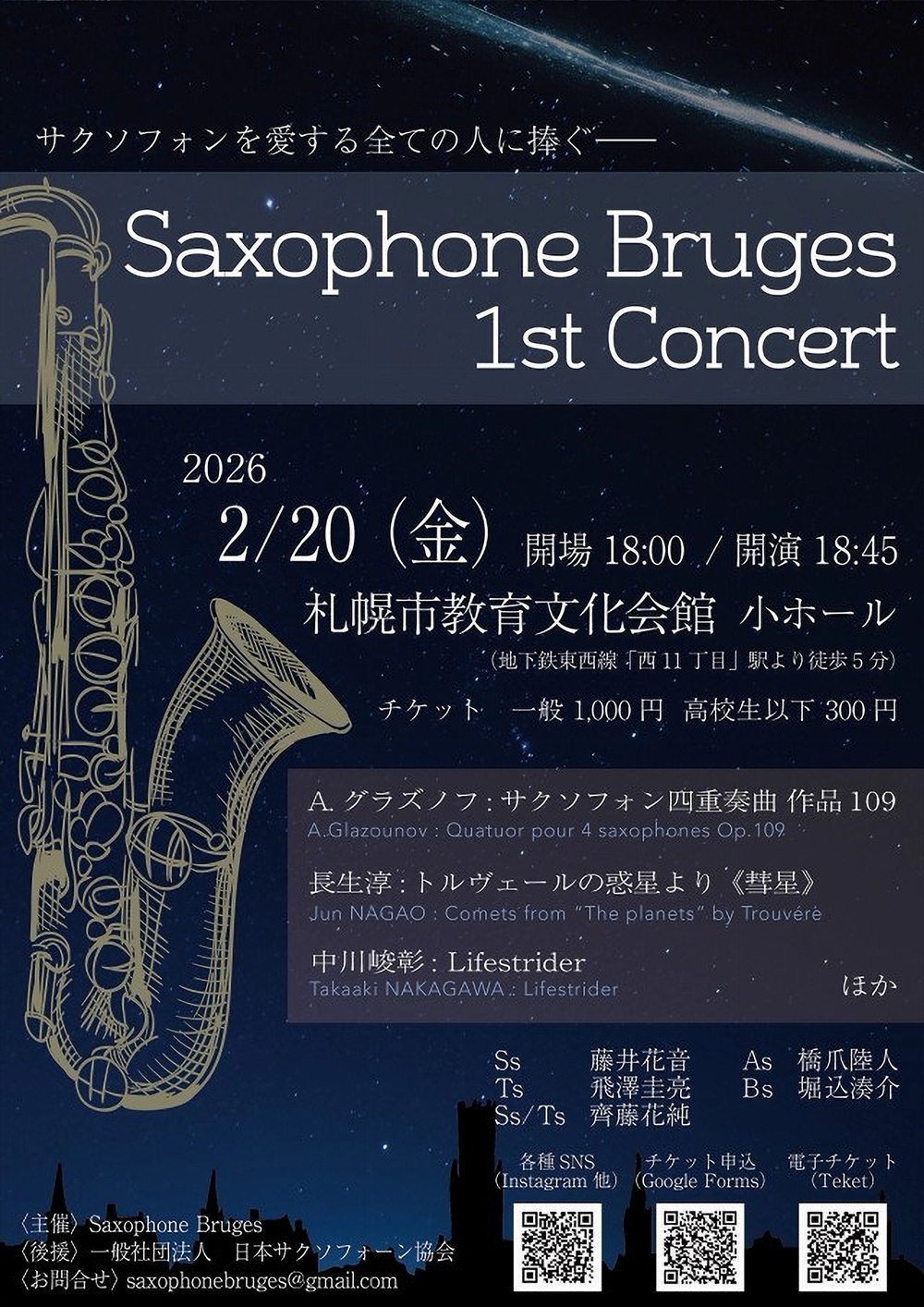 サクソフォンを愛する全ての人に捧ぐ――Saxophone Bruges 1st Concert 2月20日(金)18:45 札幌市教育文化会館小ホール(札幌市中央区北1条西13丁目7) 出演 ソプラノ・サクソフォン/藤井 花音 アルト・サクソフォン/橋爪 陸人 テノール・サクソフォン/飛澤 圭亮 バス・サクソフォン/堀込 湊介 ソプラノ&テノール・サクソフォン/齊藤 花純 曲名 A.グラズノフ/サクソフォン四重奏曲作品109 長生淳/『トルヴェールの惑星』より「彗星」 中川峻彰/Lifestrider …ほか |