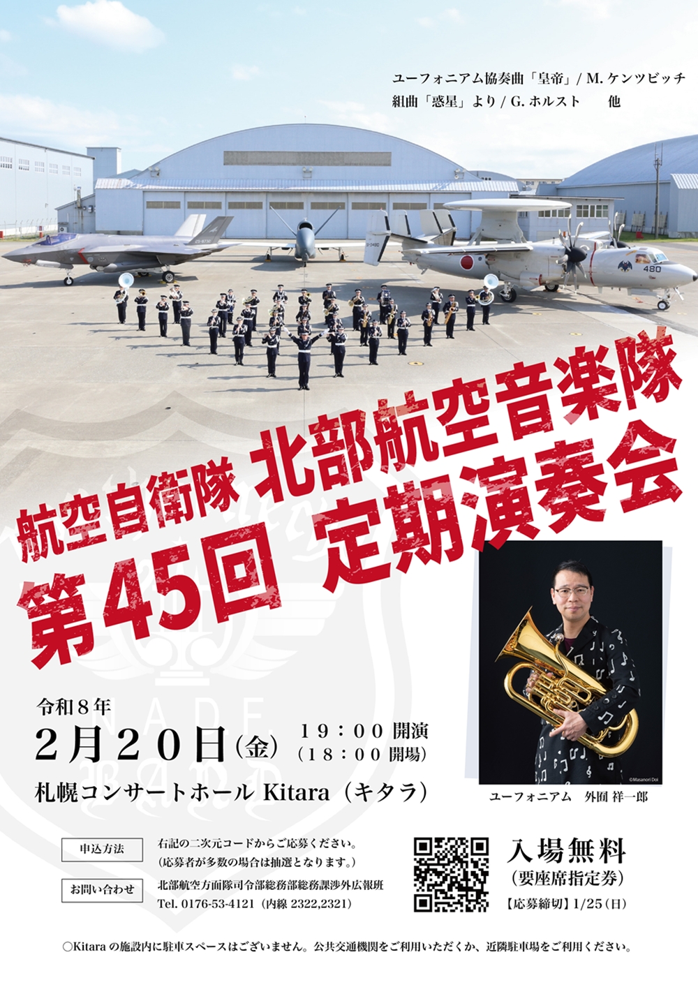 航空自衛隊北部航空音楽隊第45回定期演奏会 2月20日(金)19:00 札幌コンサートホールKitara大ホール 出演 ユーフォニアム/外囿祥一郎 吹奏楽/航空自衛隊北部航空音楽隊 曲目 M.ケンツビッチ/ユーフォニアム協奏曲「皇帝」 G.ホルスト/組曲「惑星」より ‥‥他 |