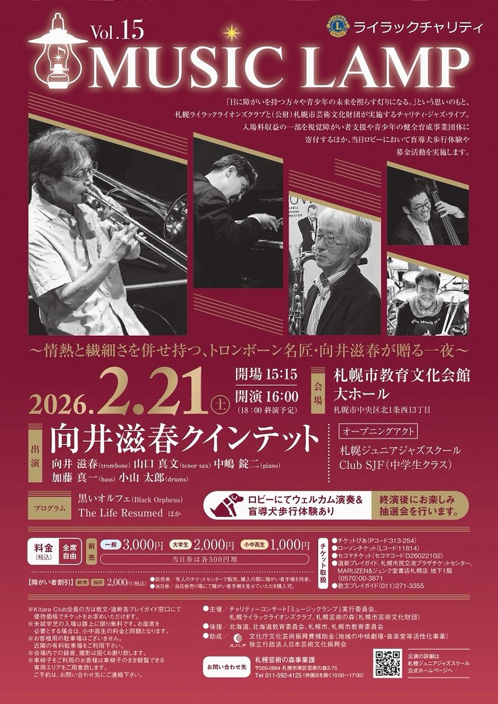 ライラックチャリティMUSIC LAMP VOL.15 2月21日(土)16:00 札幌市教育文化会館大ホール(札幌市中央区北1条西13丁目7) 出演 向井滋春クインテット トロンボーン/向井 滋春 テナー・サックス/山口 真文 バス/加藤 真一 ドラムス/小山 太郎 オープニングアクト 札幌ジュニアスクール Club SJF(中学生クラス) プログラム ルイス・ボンファ/黒いオルフェ(Black Orpheus) Michel Legrand/The Life Resuned ‥‥ほか |