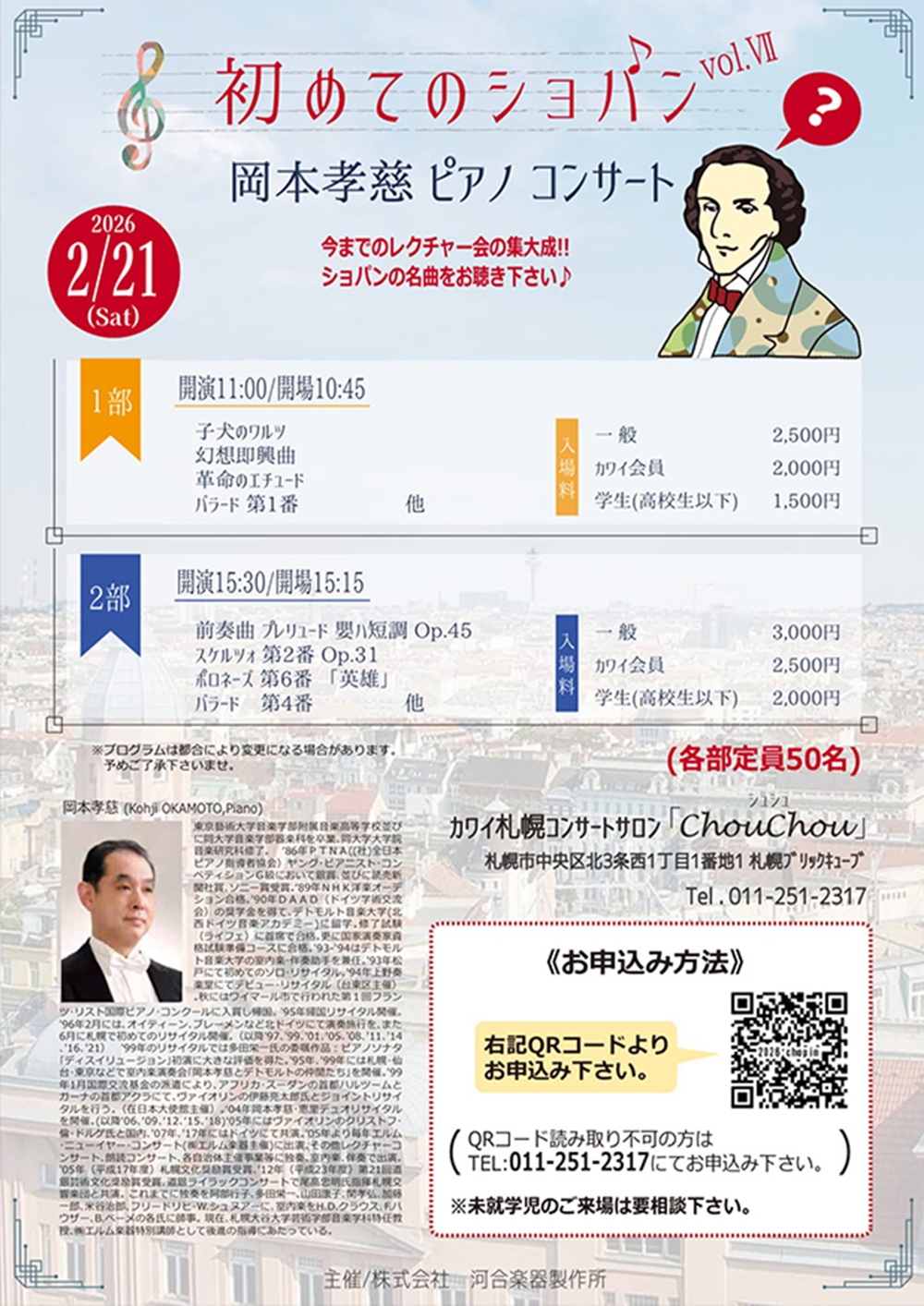 初めてのショパンVol.Ⅶ岡本孝慈 ピアノコンサート 2月21日(土)第1部 11:00 第2部 15:30 カワイ札幌コンサートサロン「ChouChou」(札幌市中央区北3条西1丁目1-1札幌ブリュックキューブ) 出演 ピアノ/岡本 孝慈(札幌大谷大学芸術学部音楽学科特任教授) プログラム 第1部 ショパン/子犬のワルツ ショパン/幻想即興曲 ショパン/革命のエチュード ショパン/バラード第1番 ‥‥他 第2部 ショパン/前奏曲プレリュード嬰ハ短調Op.45 ショパン/スケルツォ第2番Op.31 ショパン/ポロネーズ第6番「英雄」 ショパン/バラード第4番 ‥‥他 |