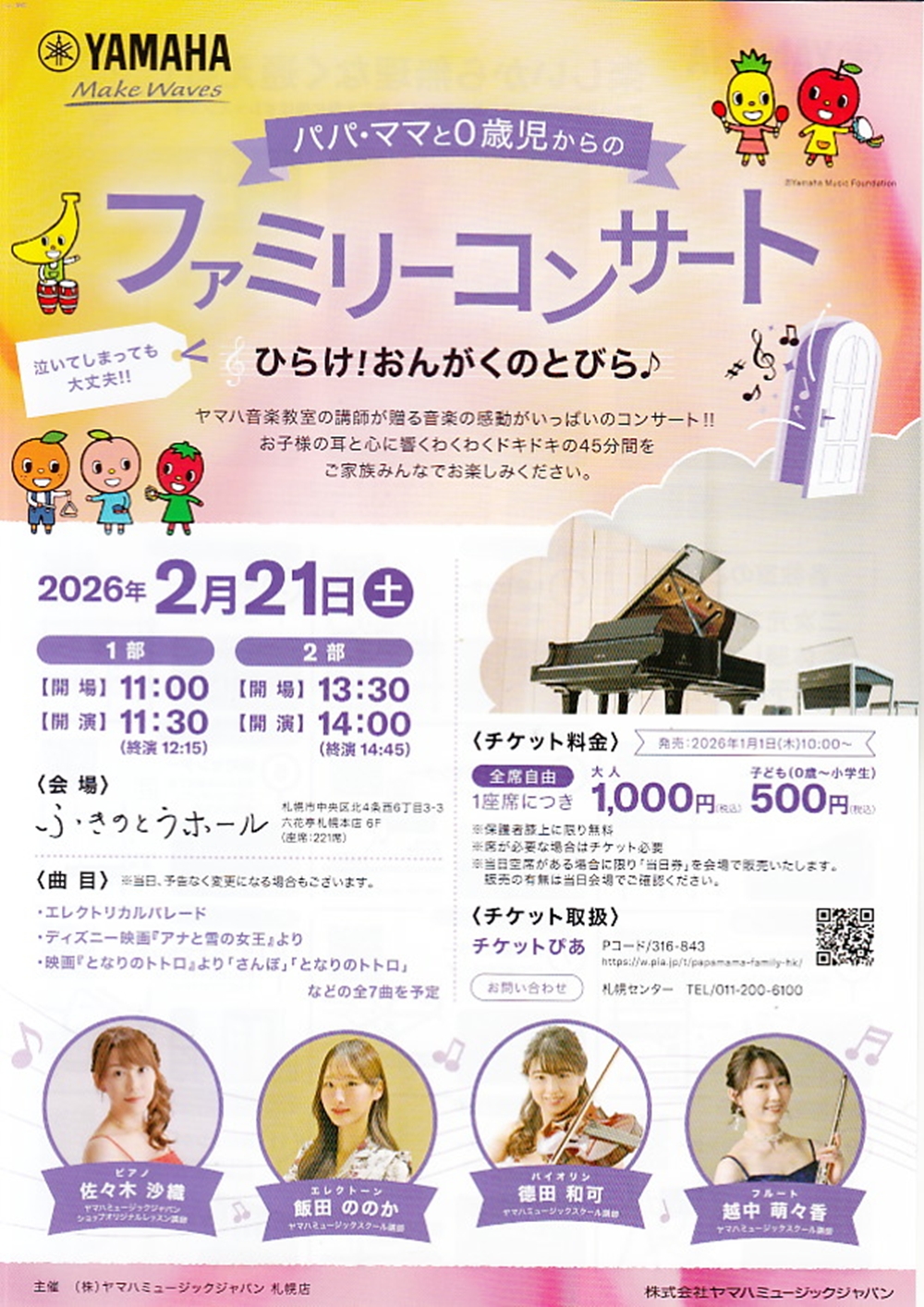 YAMAHA Make Wavesパパ・ママと0歳児からの ファミリーコンサート ひらけ!おんがくのとびら♪ 2月21日(土)第1部 11:30~12:15 第2部 14:00~14:45 ふきのとうホール(札幌市中央区北4条西6丁目3-3六花亭札幌本店6階) 出演 ピアノ/佐々木沙織 エレクトーン/飯田ののか ヴァイオリン/徳田 和可 フルート/越中萌々香 曲目 J.ジャック・ペリー=G.キングスレイ/エレクトリカルパレード K.A—ロペス=R.ロペス/ディズニー映画『アナと雪の女王』より 久石譲/映画『となりのトトロ』より「さんぽ」「となりのトトロ」 ‥‥など全7曲を予定 |
