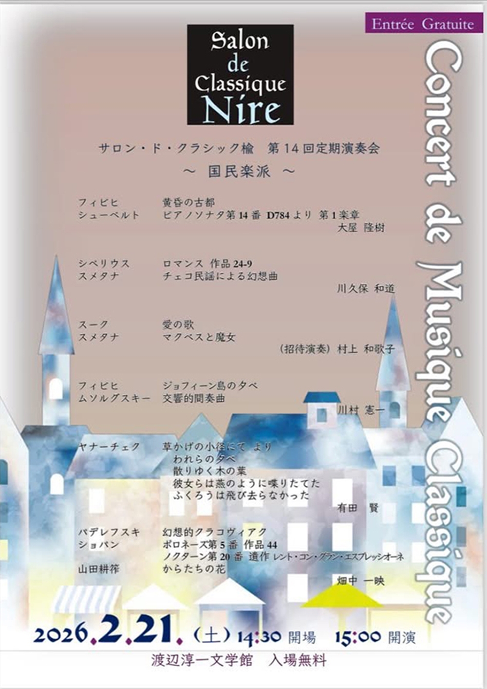 Salon de Classiqie Nireサロン・ド・クラシック楡 Concert de Musique Classique 第14回定期演奏会 ~ 国民楽派 ~ 2月21日(土)15:30 渡辺淳一文学館(札幌市中央区南12条西6丁目414) 出演者・演奏曲目 ・大星 隆樹 フィビヒ/黄昏の古都 シューベルト/『ピアノ・ソナタ第14番』D784より「第1楽章」 ・川久保和道 シベリウス/ロマンス作品24-9 スメタナ/チェコ民謡による幻想曲 ・村上和歌子(招待演奏) スーク/愛の歌 スメタナ/マクベスと魔女 ・川村 憲一 フィヒヒ/ジョフィーン島の夕べ ムソルグスキー/交響的間奏曲 ・有田 賢 ヤナーチェク/『草かげの小路にて』より「われらの夕べ」「散りゆく木の葉」「彼女らは燕のように喋りたてた」 「ふくろうは飛び去らなかった」 ・畑中 一映 パデレフスキ/幻想的クラコヴィアク ショパン/ポロネーズ第5番作品44 ノクターン第20番 遺作 レント・ゴン・グラン・エクスプレッシオーネ 山田耕筰/からたちの花 |