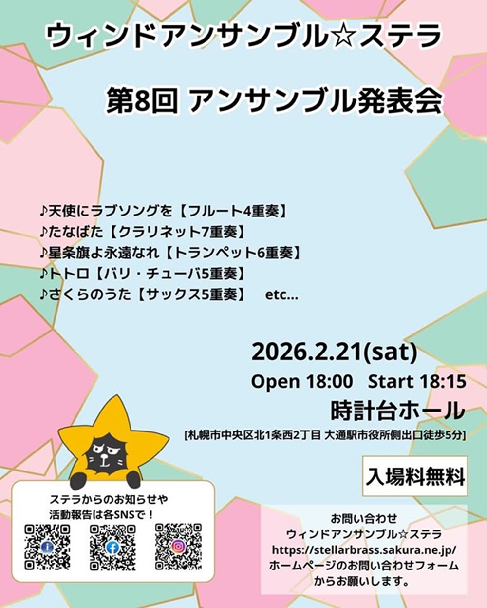 ウィンドアンサンブル☆ステラ第8回アンサンブル発表会 2月21日(土)18:15 札幌市時計台ホール(札幌市中央区北1条西2丁目) 出演 吹奏楽/ウィンドアンサンブル☆ステラ 曲目 天使にラブソングを/天使にラブソングを(フルート四重奏) 酒井格/たなばた(クラリネット7重奏) J.P.スーザ/星条旗よ永遠なれ(トランペット6重奏) 久石譲/トトロ(バリ・チューバ5重奏) 福田洋介/さくらのうた(サックス5重奏) |