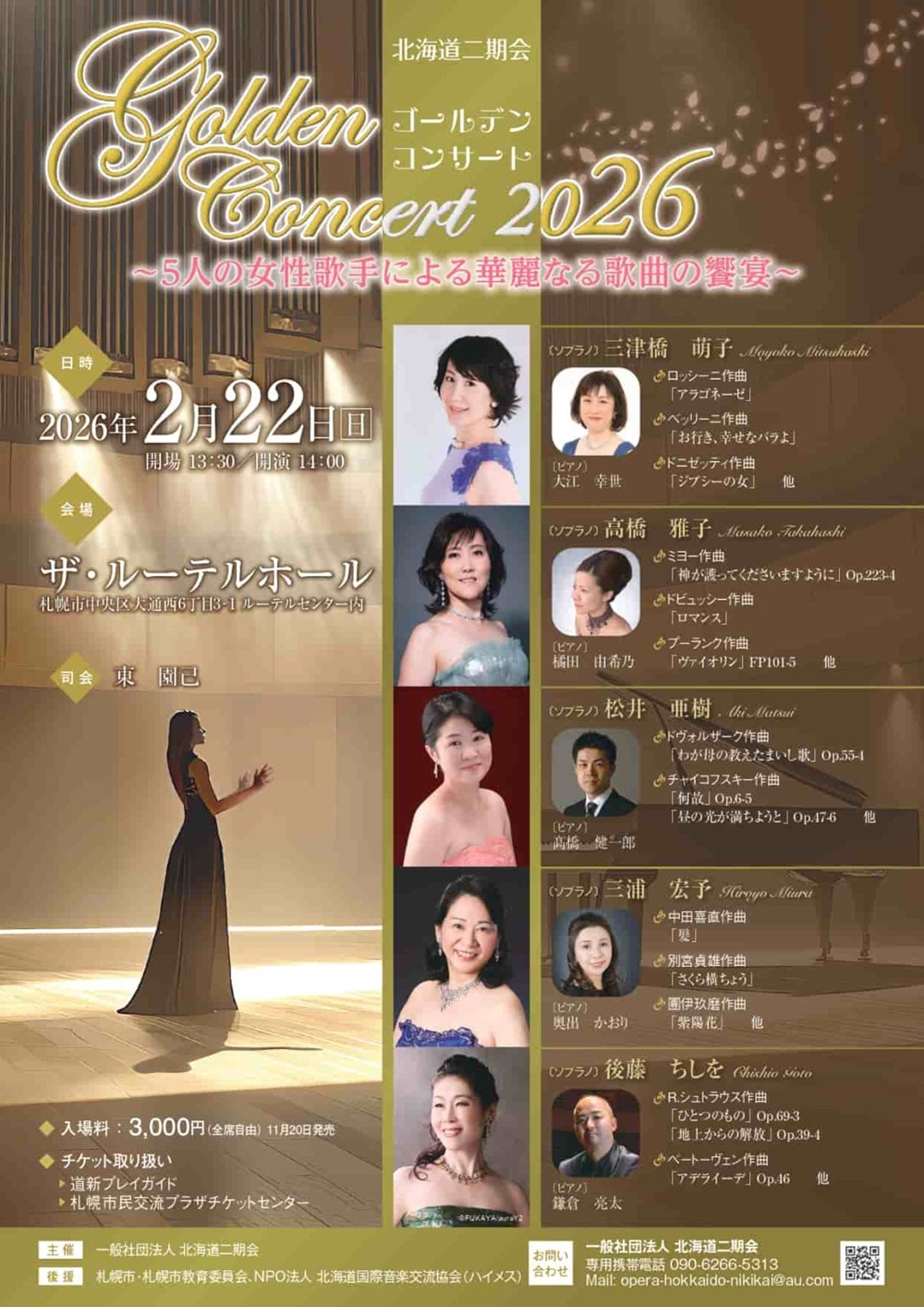 北海道二期会ゴールデンコンサート2026 5人の女性歌手による華麗なる歌曲の饗宴 2月22日(日)14:00 ザ・ルーテルホール(札幌市中央区大通西6丁目3-1) 出演 ①ソプラノ/三津橋萌子 (ピアノ/大江 幸世) ②ソプラノ/高橋 雅子 (ピアノ/橘田由希乃) ③ソプラノ/松井 亜樹 (ピアノ/髙橋健一郎) ④ソプラノ/三浦 宏予 (ピアノ/奥出かおり) ⑤ソプラノ/後藤ちしを (ピアノ/鎌倉 亮太) 司会/東 園己 プログラム ①ロッシーニ/「アラゴネーゼ」 ベッリーニ/「お行き、幸せなバラよ」 ドニゼッティ/「ジプシーの女」 …他 ②ミヨー/「神が譲ってくださいますように」Op.223-1 ドビュッシー/「ロマンス」 プーランク/「ヴァイオリン」FP101-5 …他 ③ドヴォルザーク/「わが母の教えたまいし歌」Op.55-1 チャイコフスキー/「何故」Op.6-5 「昼の光が満ちようと」Op.47-6 …他 ④中田喜直/「髪」 別宮貞雄/「さくら横ちょう」 團伊玖磨/「紫陽花」 …他 ⑤R.シュトラウス/「ひとつのもの」Op.69-3 「地上からの解放」Op.39-4 ベートーヴェン/「アデライーデ」Op.46 …他 |