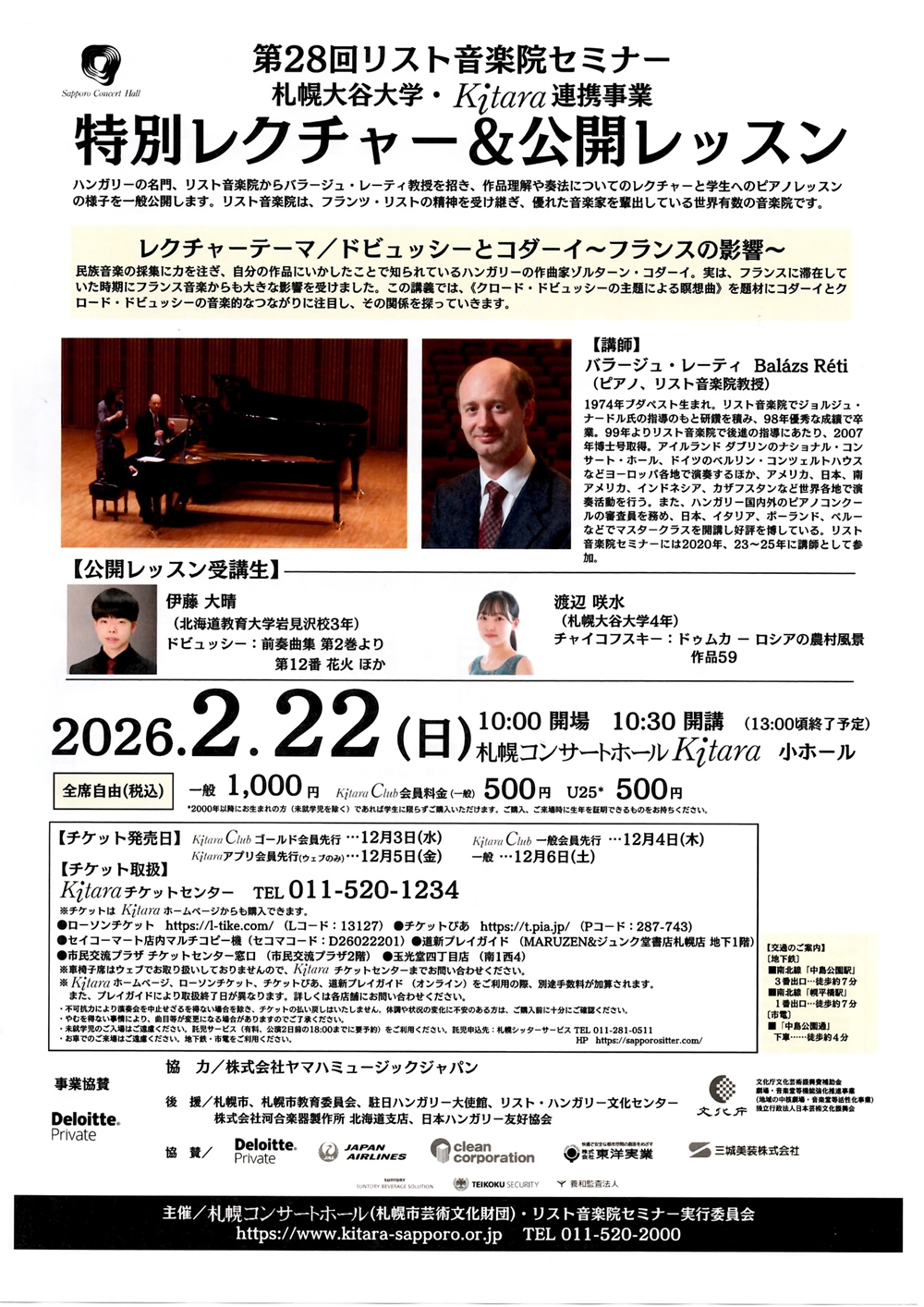 札幌大谷大学・Kitara連携事業 特別レクチャー&公開レッスン 2月22日(日)10:30 札幌コンサートホールKitara小ホール 出演 講師/バラージュ・レーティ(ピアノ、リスト音楽院教授) 受講生/伊藤 大晴(北海道教育大学岩見沢校3年) 渡辺 咲水(札幌大谷大学4年) プログラム レクチャーテーマ「ドビュッシーとコダーイ~フランスの影響~」 演奏予定曲 ・伊藤 大晴(北海道教育大学岩見沢校3年) ドビュッシー/『前奏曲集第2巻』より「第12番 花火」 他 ・渡辺 咲水(札幌大谷大学4年) チャイコフスキー/ドゥムカ ロシアの農村風景作品59 |