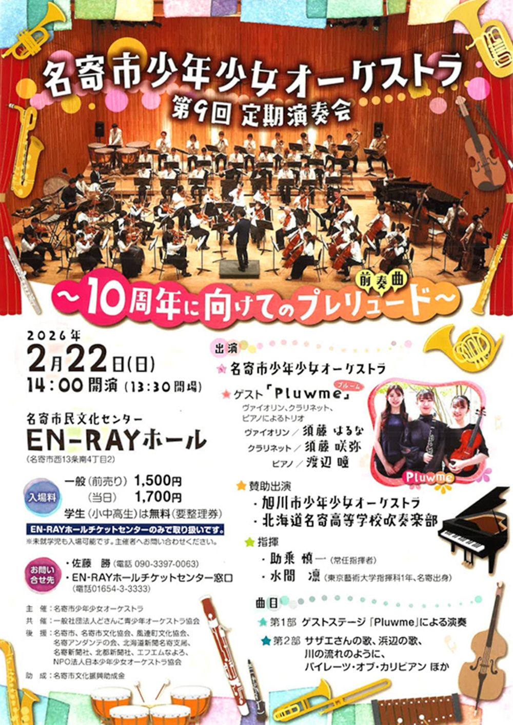 名寄市少年少女オーケストラ第9回定期演奏会 ~10周年に向けてのプレリュード~ 2月22日(日)14:00 名寄市民文化センターEN-RAYホール(名寄市西13条南4丁目2) 出演 指揮/助乗 慎一(常任指揮者) 水間 凛(東京藝術大学指揮科1年、名寄出身) 管弦楽/名寄市少年少女オーケストラ ゲスト「Pluwme(プルーム)」ヴァイオリン、クラリネット、ピアノによるトリオ ヴァイオリン/須藤はるな クラリネット/須藤 咲弥 ピアノ/渡辺 瞳 賛助出演 旭川少年少女オーケストラ 北海道名寄高等学校吹奏楽部 曲目 第1部 ゲストステージ「Pluwme」による演奏 第2部 筒美京平/サザエさんの歌 成田為三/浜辺の歌 見岳章/川の流れのように K.バデルト=H.ジマー/パイレーツ・オブ・カリビアン ‥‥ほか |