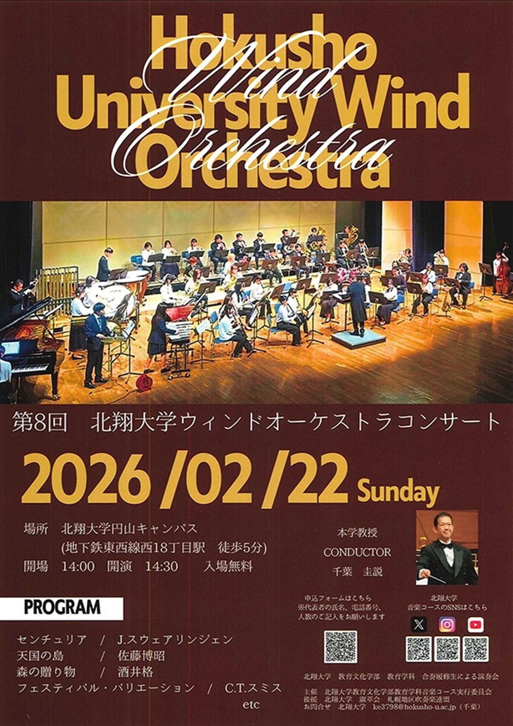 Hokusho University Wind Orchestra北翔大学ウィンドオーケストラ 第8回コンサート 2月22日(日)14:30 北翔大学札幌円山キャンパス(札幌市中央区南1条西22丁目1-1) 出演 指揮/千葉 圭説(北翔大学教授) 吹奏楽/北翔大学ウィンドオーケストラ 曲目 J.スウェアリンジェン/センチュリア 佐藤博昭/天国の島 酒井格/森の贈り物 C.T.スミス/フェスティバル・バリエーション ‥‥etc. |