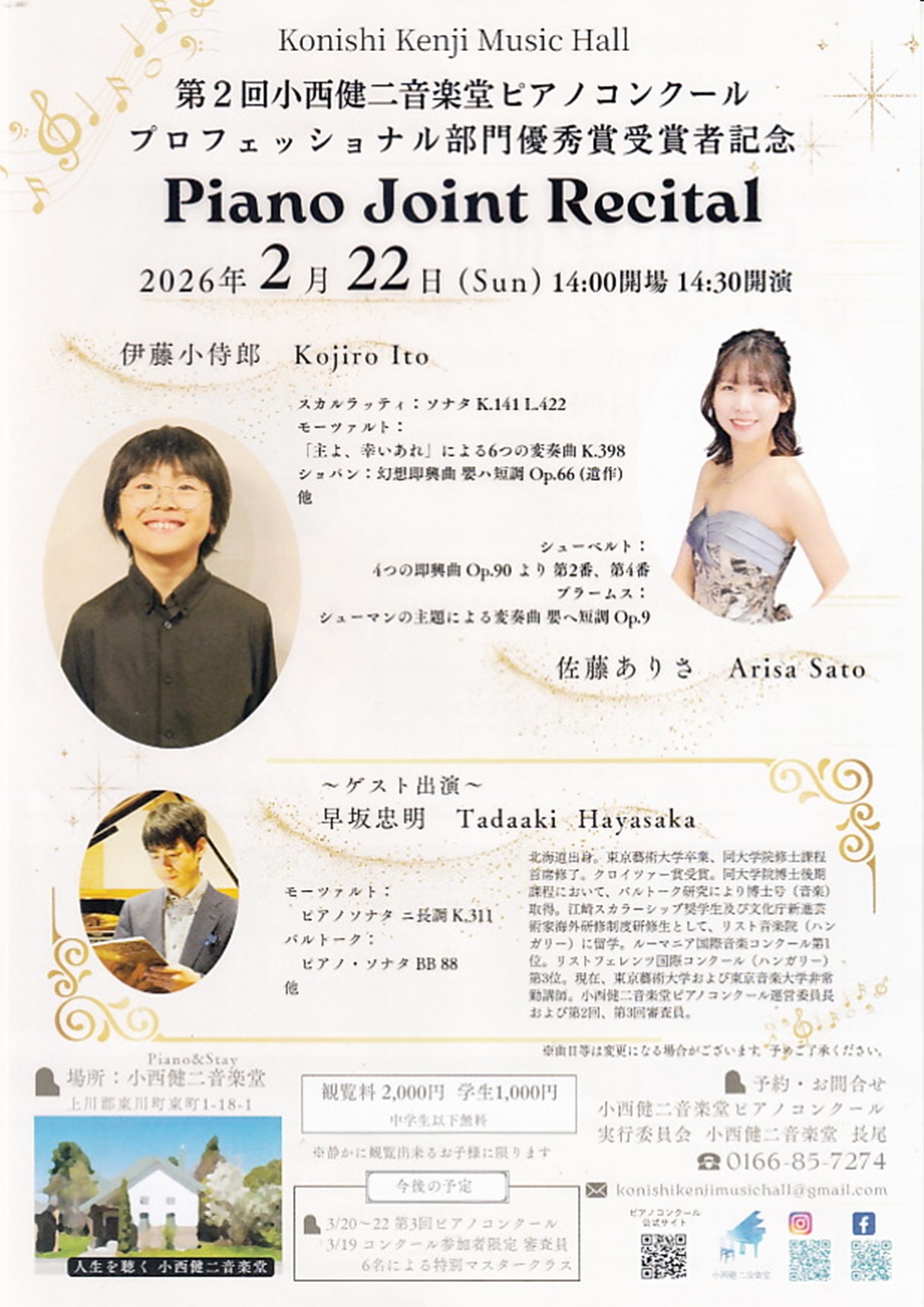 Konishi Kenji Music Hall第2回小西健二音楽堂ピアノコンクール プロフェッショナル部門優秀賞受賞者記念 Piano Joint Recital 2月22日(日)14:30 小西健二音楽堂(上川郡東川町東町1丁目18-1) 出演者・演奏曲目 ・伊藤小侍郎(ITO Kojiro) スカルラッティ/ソナタK.141 L.422 モーツァルト/「主よ、幸いあれ」による6つの変奏曲K.398 ショパン/幻想即興曲嬰ハ短調Op.66(遺作) ・佐藤ありさ(SATO Arisa) シューベルト/『4つの即行曲』Op.90より「第2番」「第4番」 ブラームス/シューマンの主題による変奏曲嬰ヘ短調Op.9 ~ゲスト出演~ ・早坂 忠明(HAYASAKA Tadaaki) モーツァルト/ピアノ・ソナタニ長調K.311 バルトーク/ピアノ・ソナタBB88 ‥‥他 |