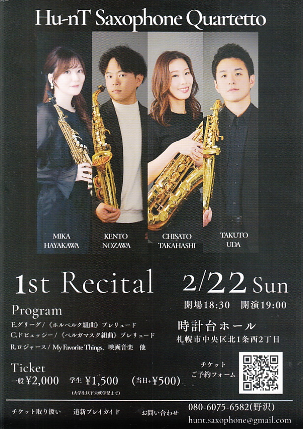 Hu-nT Saxophone Quartetto1st Recital 2月22日(日)19:00 札幌市時計台ホール(札幌市中央区北1条西2丁目) 出演 サクソフォン/早川 実花、野沢 研斗、高橋 茅里、宇田 拓人 曲目 E.グリーグ/『ホルベルク組曲』より「プレリュード」 C.ドビュッシー/『ベルガマスク組曲』より「プレリュード」 R.ロジャース/My Favoritc Things 映画音楽 ‥‥他 |