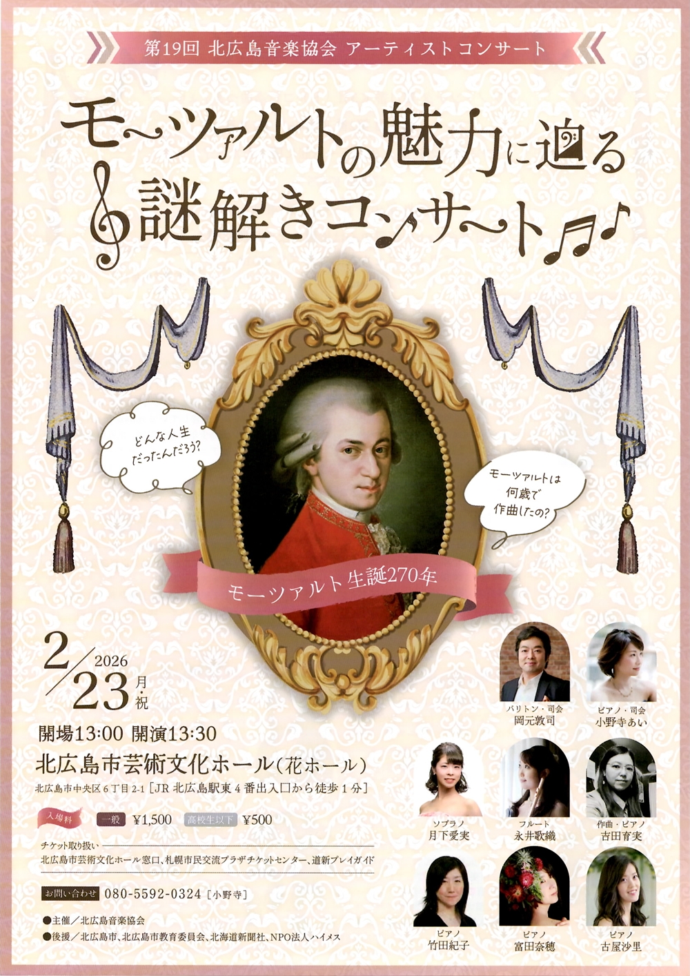 モーツァルトの魅力に迫る 謎解きコンサート モーツァルト生誕270年 2月23日(月・祝)13:30 北広島芸術文化ホール(花ホール。北広島中央区6丁目2-1) 出演 バリトン/司会/岡元 敦司(北翔大学・北海道教育大学・札幌大谷大学各講師) ピアノ/小野寺あい(北広島混声合唱団ピアニスト) ソプラノ/月下 愛実(第31ハイメスコンクール第1位) フルート/永井 歌織 作曲・ピアノ/吉田 育実(PSP音楽教室代表) ピアノ/竹田 紀子、富田 奈穂、古屋 沙理 プログラム モーツァルト作曲 ピアノ・ソナタ第11番K.331「トルコ行進曲つき」より フルート協奏曲第2番K.314より第1楽章 『フィガロの結婚K.492』より「訴訟に勝っただと?」 幻想曲K.475 交響曲第40番K.550より第1楽章 『魔笛K.620』より「復讐の心は地獄のように胸に燃え」 アヴェ・ヴェルム・コルブスK.618 ……etc... |