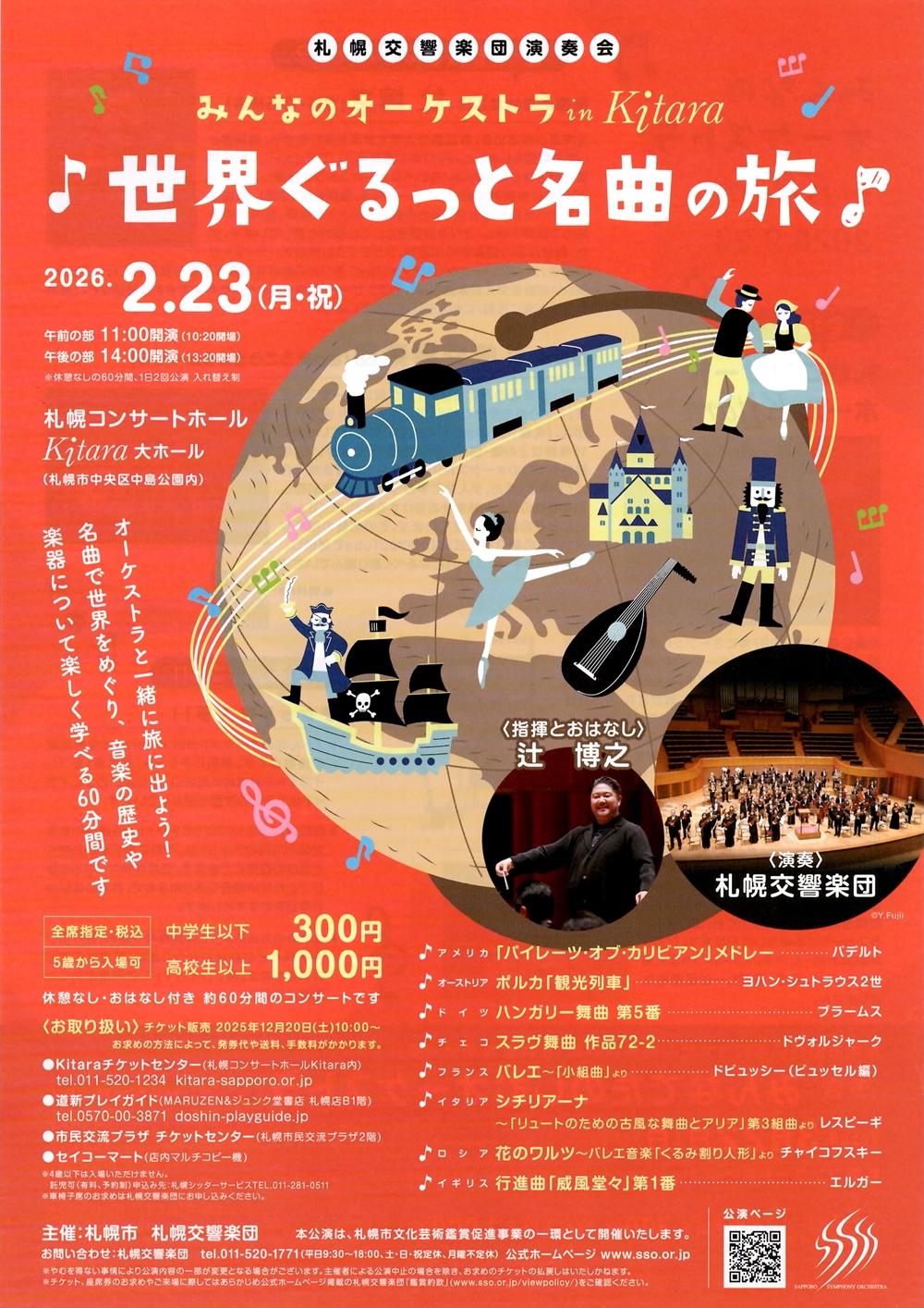 札幌交響楽団演奏会みんなのオーケストラ in Kitara ♪世界ぐるっと名曲の旅♪ 2月23日(月)①11:00 ②14:00 札幌コンサートホールKitara大ホール 出演 指揮とおはなし/辻 博之 管弦楽/札幌交響楽団 曲目 バデルト/「パイレーツ・オブ・カリビアン」メドレー(アメリカ) ヨハン・シュトラウス2世/ポルカ「観光列車」(オーストリア) ブラームス/ハンガリー舞曲第5番(ドイツ) ドヴォルジャーク/スラヴ舞曲作品72-2(チェコ) ドビュッシー(ドビュッシー編)/バレエ~「小組曲」より(フランス) レスピーギ/シチリアーナ~「リュートのための古風な舞曲とアリア」第3組曲より(イタリア) チャイコフスキー/バレエ音楽『くるみ割り人形』より「花のワルツ」(ロシア) エルガー/行進曲「威風堂々」第1番(イギリス) |