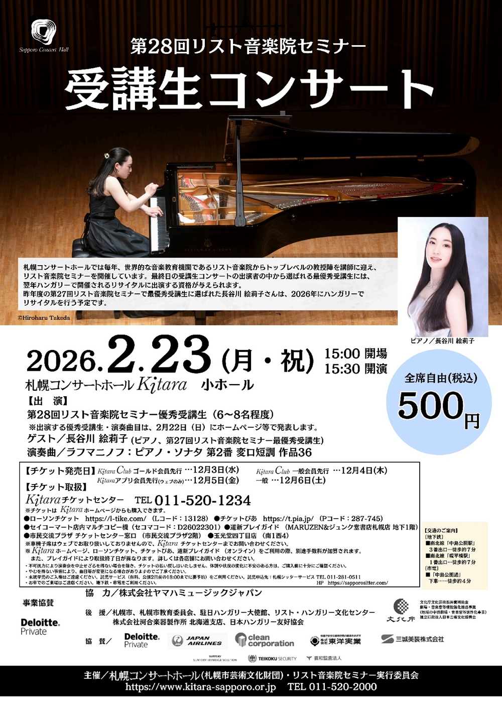 第28回リスト音楽院セミナー受講生コンサート 2月23日(月・祝)15:30 札幌コンサートホールKitara小ホール 出演 第28回リスト音楽院セミナー優秀受講生(6~8名程度) ※出演する優秀受講生・演奏曲目は、2月22日(日)にホームページ等で発表します。 ピアノ/長谷川絵莉子(ゲスト。第27回リスト音楽院セミナー最優秀受講生) 曲目 第28回リスト音楽院セミナー優秀受講生6~8名程度 ゲスト(ピアノ)/長谷川絵莉子(第27回リスト音楽院セミナー最優秀受講生) プログラム ※出演する優秀受講生・演奏曲目は、2月22日(日)にホームページ等で発表します。 ラフマニノフ/ピアノ・ソナタ第2番変ロ短調作品36(ピアノ/長谷川絵莉子) |