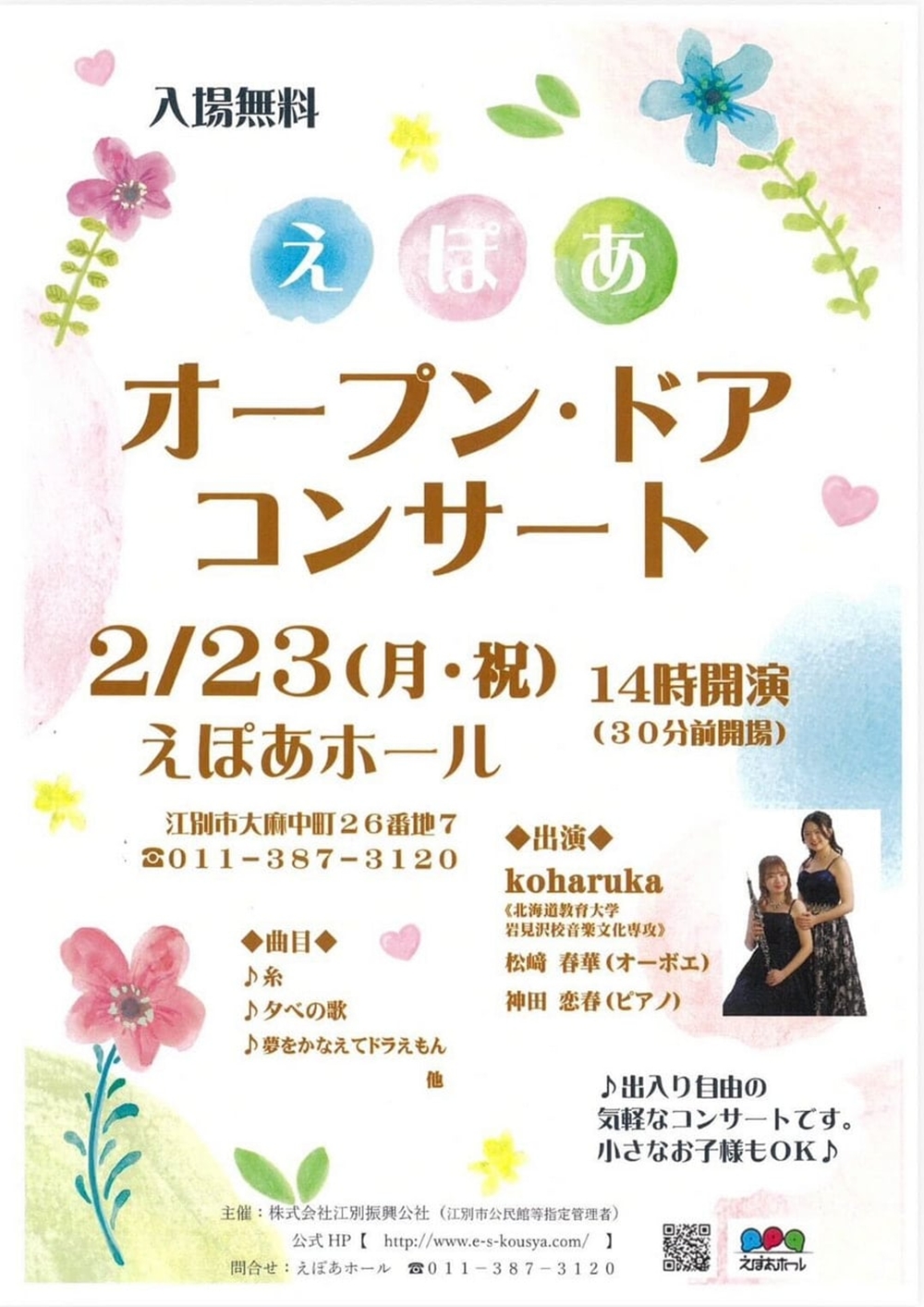 えぽあオープン・ドアコンサート 2月23日(月・祝)14:00 えぽあホール(江別市民文化ホール。江別市大麻中町26-7) 出演 ユニット「koharuka」 オーボエ/松﨑 春華(北海道教育大学岩見沢校音楽文化専攻在学中) ピアノ/神田 恋春(北海道教育大学岩見沢校音楽文化専攻在学中) 曲目 中島みゆき/糸 R.シューマン/夕べの歌 黒須克彦/夢をかなえてドラえもん |
