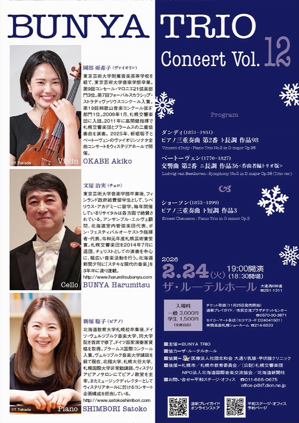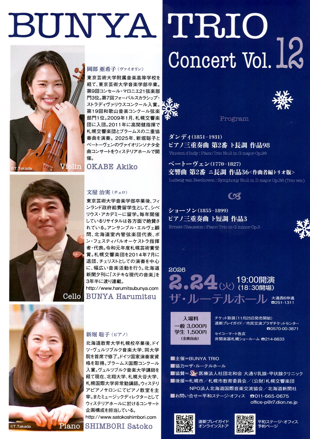 BUNYA TRIOConcertVol.12 2月24日(火)19:00 ザ・ルーテルホール(札幌市中央区大通西6丁目3-1) 出演 Violln/岡部亜希子(札響ヴァイオリン奏者) Cello/文屋 治実(ボン・フェスティバルオーケストラ指揮者兼代表) ピアノ/新堀 聡子(ウィスティリアホールミュージックディレクター) 曲目 ダンディ/ピアノ三重奏曲第2番ト長調作品98 ベートーヴェン/交響曲第2番ニ長調作品36<作曲者編トリオ版> ≪休憩≫ シューマン/ピアノ三重奏曲ト短調作品3 |