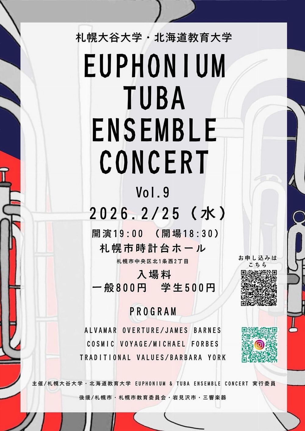 札幌大谷大学・北海道教育大学EUPHONIUM TUBA ENSEMBLE CONCERT 2月25日(水)19:00 札幌市時計台ホール(札幌市中央区北1条西2丁目) 出演 演奏/北海道教育大学並びに札幌大谷大学でユーフォニアム・チューバを学ぶ学生による合同コンサート PROGRAM J.Barnes/Alvamar overture M.Forbes/Cosmic voyage B.York/Traditional Values |