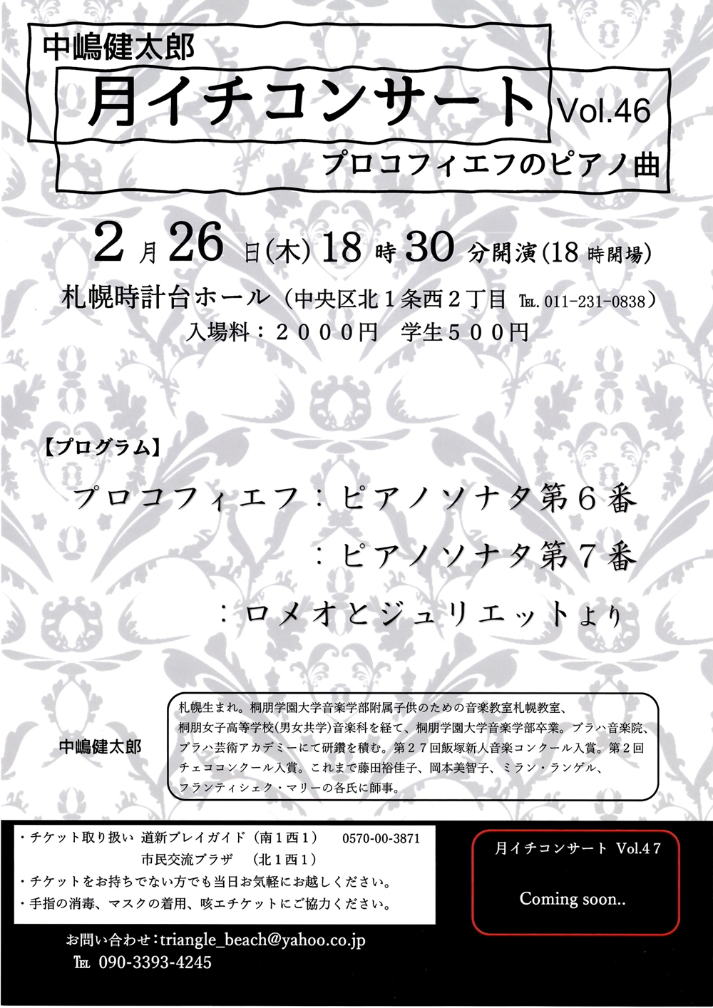 月イチコンサートVol.46 プロコフィエフのピアノ曲 2月26日(木)18:30 札幌市時計台ホール(札幌市中央区北1条西2丁目) 出演 ピアノ/中嶋健太郎 曲目 プロコフィエフ/ピアノ・ソナタ第6番 プロコフィエフ/ピアノ・ソナタ第7番 プロコフィエフ/「ロメオとジュリエット」より |