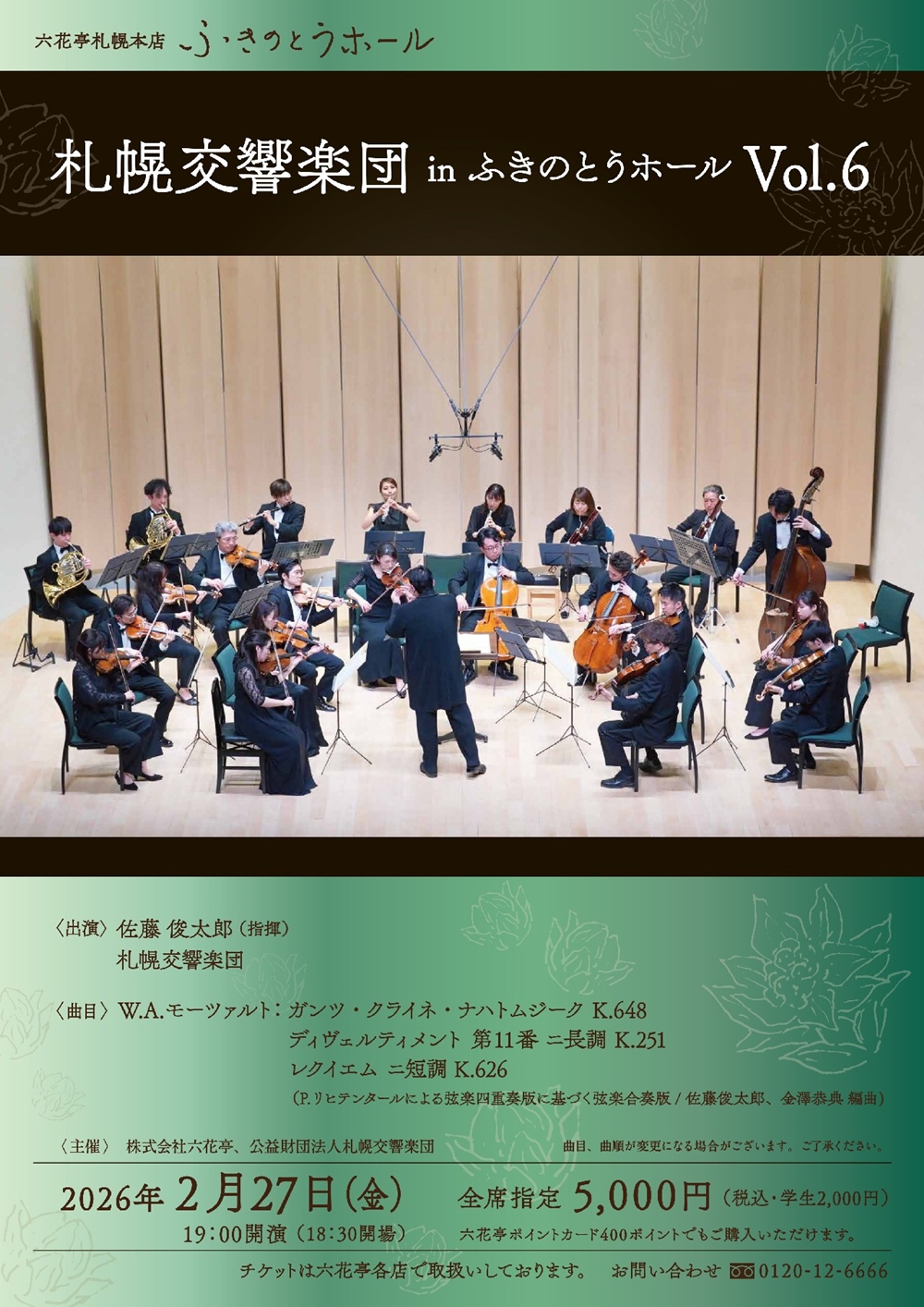 札幌交響楽団in ふきのとうホールVol.6 2月27日(金)19:00 ふきのとうホール 出演 指揮/佐藤俊太郎(アンサンブル・アール・ヴィヴァン音楽監督) 演奏/札幌交響楽団 曲目 W.A.モーツァルト/ガンツ・クライネ・ナハトムジークK.648 W.A.モーツァルト/ディヴェルティメント第11番ニ長調K.251 W.A.モーツァルト/レクイエムニ短調K.626 (P.リヒテンタールによる弦楽四重奏版に基づく弦楽合奏版。佐藤俊太郎、金沢恭典編曲) |