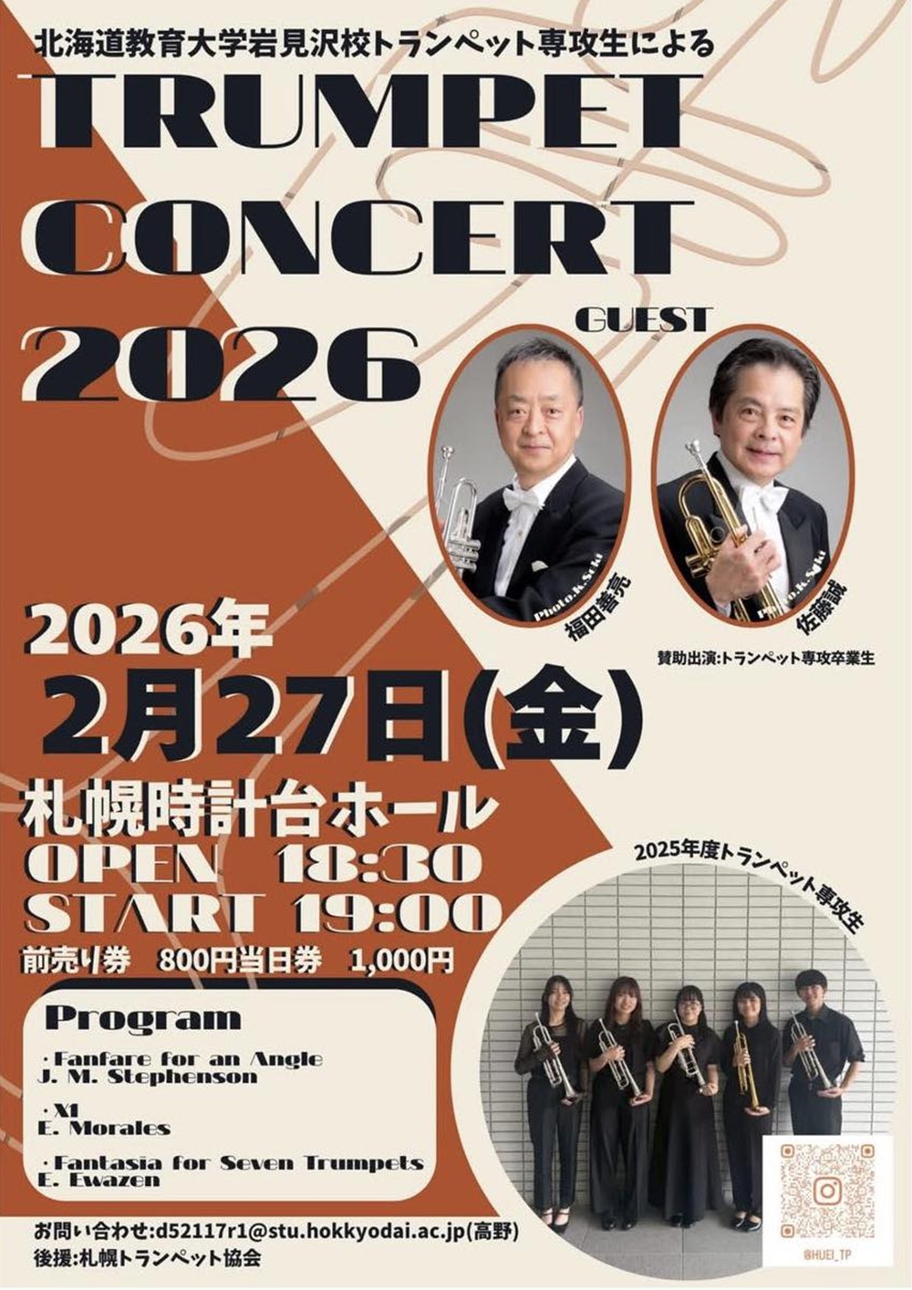 北海道教育大学岩見沢校トランペット専攻生によるTRUMPET CONCERT 2026 2月27日(金)19:00 札幌時計台ホール(札幌市中央区北1条西2丁目) 出演 トランペット/福田 善亮(ゲスト。元札響トランペット首席奏者) トランペット/佐藤 誠(ゲスト賛助出演。元札響奏者・岩見沢校トランペット専攻卒業生) 演奏/2025年度北海道教育大学岩見沢校トランペット専攻生 曲目 J.M.Stephenson/Fanfare for an Angle E.Morales/Ⅺ E.Ewazen/Fantasia for Seven Trumpets ‥‥and more. |
