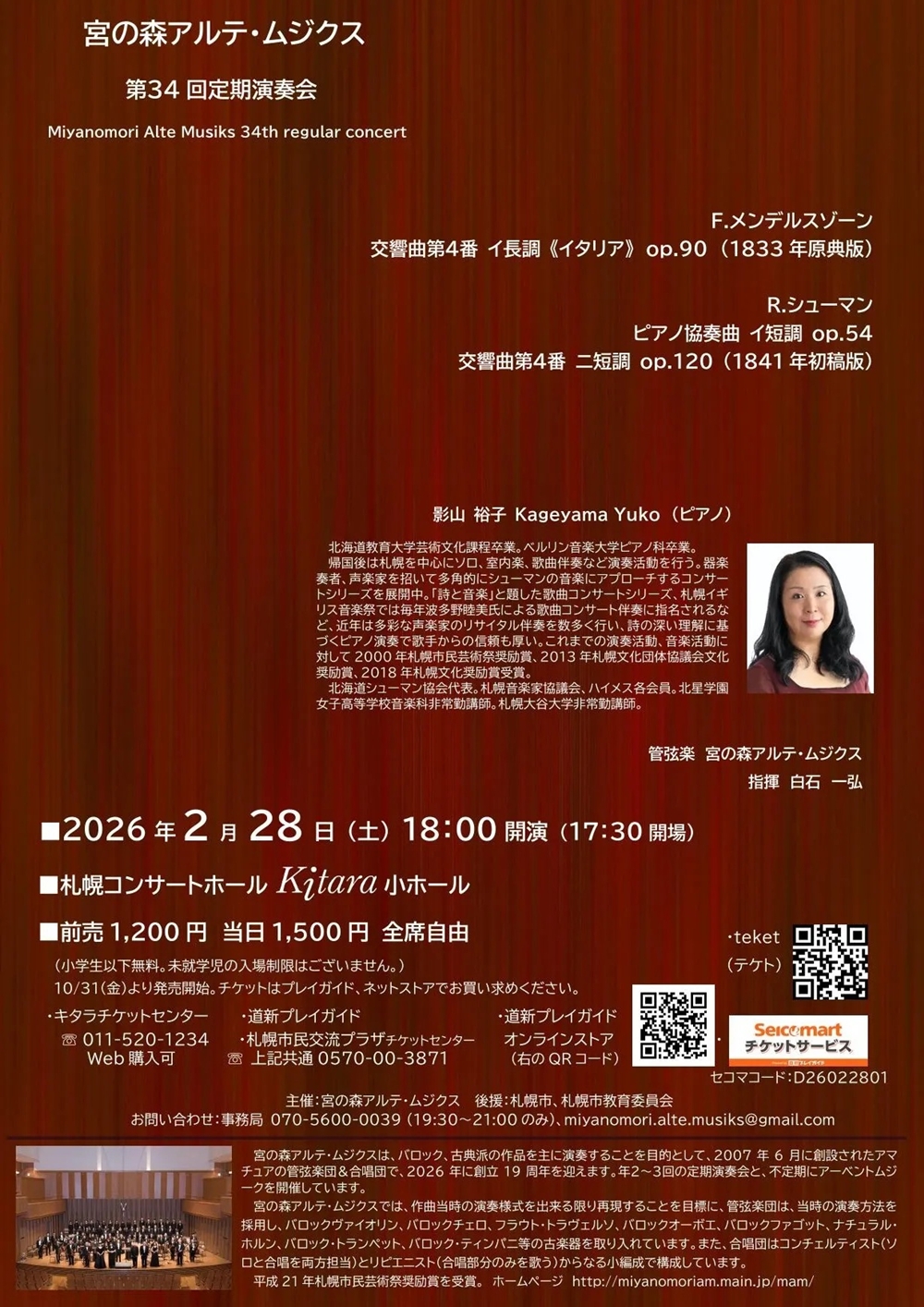 宮の森アルテ・ムジクス第34回定期演奏会 2月28日(土)18:00 札幌コンサートホールKitara小ホール 出演 指揮/白石 一弘(宮の森アルテ・ムジクス代表) ピアノ独奏/影山 裕子(北海道シューマン協会代表) 管弦楽/宮の森アルテ・ムジクス 曲目 F.メンデルスゾーン/交響曲第4番《イタリア》イ長調Op.90 R.シューマン/ピアノ協奏曲イ短調Op.54 R.シューマン/交響曲第4番ニ短調Op.120(1841年初稿版) |