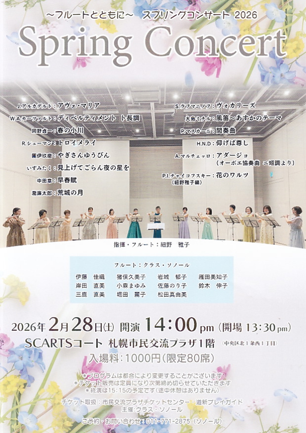 ~フルートとともに~スプリングコンサート2026 Spring Concert 2月28日(土)14:00 SCARTSコート(札幌市中央区北1丁目札幌市民交流プラザ1階) 出演 指揮・フルート/細野 雅子 フルート/クラス・ソノール 伊藤 佳織、猪俣久美子、岩城 郁子、雁田美知子、岸田 直美、小森まゆみ、佐藤のり子、鈴木 伸子、三鹿 直美、 堀田 麗子、松田真由美 曲目 J.アルカデルト/アヴェ・マリア S.ラフマニノフ/ヴォカリーズ W.A.モーツァルト/ディヴェルティメントト長調 大島ミチル/風笛~あすかのテーマ 岡野貞一/春の小川 R.マスカーニ/間奏曲 R.シューマン/トロイメライ H.N.D/仰げば尊し 團伊玖磨/やぎさんゆうびん A.マルチェッロ/『オーボエ協奏曲ニ短調』より「アダージョ」 いずみたく/見上げてごらん夜の星を P.I.チャイコフスキー(細野雅子編)/花のワルツ 中田章/早春賦 滝廉太郎/荒城の月 |