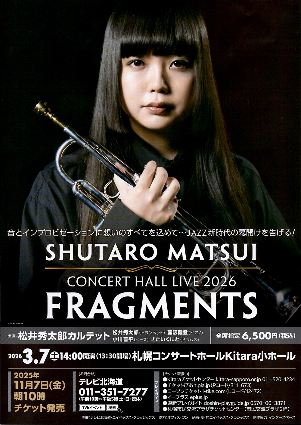 CONCERT HALL LIVE 2026 3月7日(土)14:00 札幌コンサートホールKitara小ホール 出演 松井秀太郎カルテット トランペット/松井秀太郎 ピアノ/壺阪 健登 ベース/小川 晋平 ドラムス/きたいくにと 曲目 発表されておりません。 |