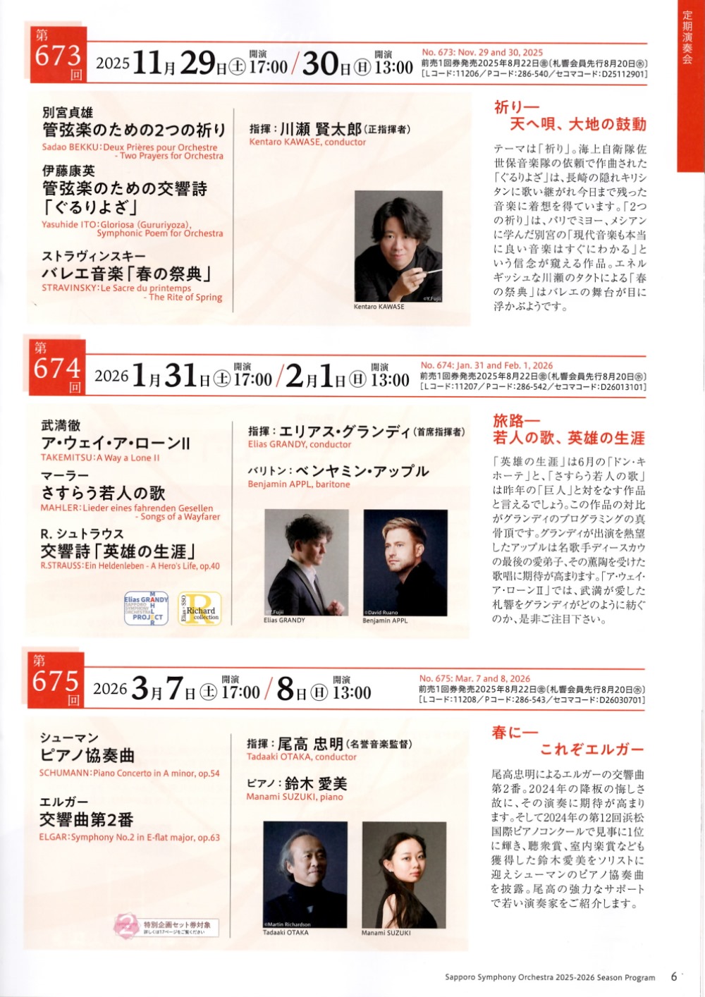 第675回定期演奏会 3月7日(土)A日程17:00 3月8日(日)B日程13:00 札幌コンサートホール大ホール 出演 指揮/尾高 忠明(札響名誉音楽監督) ピアノ/鈴木 愛美(第12回浜松国際ピアノコンクール最上位入賞者) 管弦楽/札幌交響楽団 曲目 シューマン/ピアノ協奏曲 エルガー/交響曲第2番 |