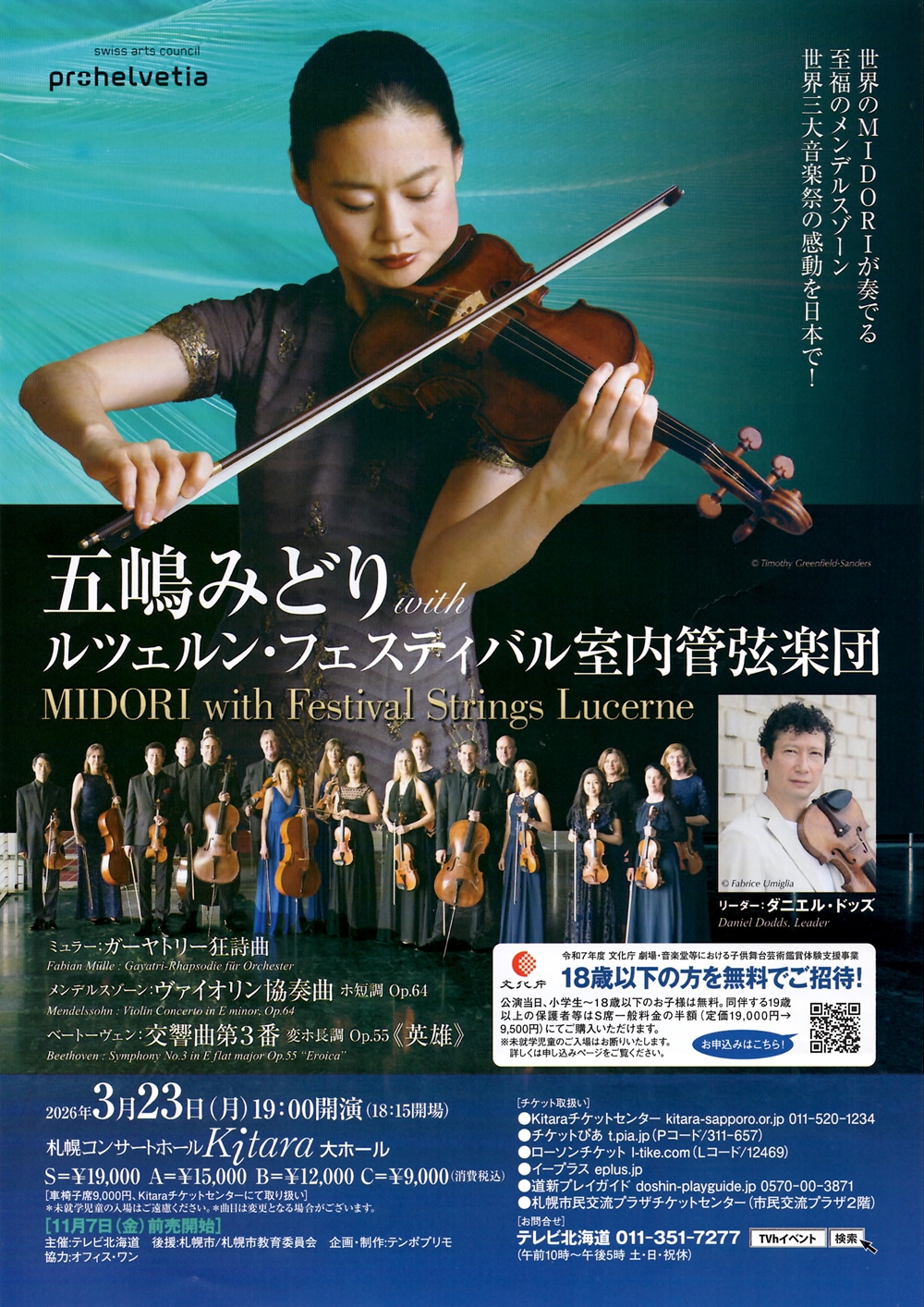 五嶋みどり withルツェルン・フェスティバル室内管弦楽団 MIDORI with Festival Strings Lucerne 3月23日(月)19:00〜21:00 札幌コンサートホールKitara大ホール 出演 ヴァイオリン/五嶋みどり ヴァイオリン/ダニエル・ドッズ(リーダー) 管弦楽/ルツェルン・フェスティバル室内管弦楽団 曲目 ミュラー/ガーヤトリー狂詩曲 メンデルスゾーン/ヴァイオリン協奏曲ホ短調Op.64 ベートーヴェン/交曲第3番変ホ長調Op.55『英雄』 |