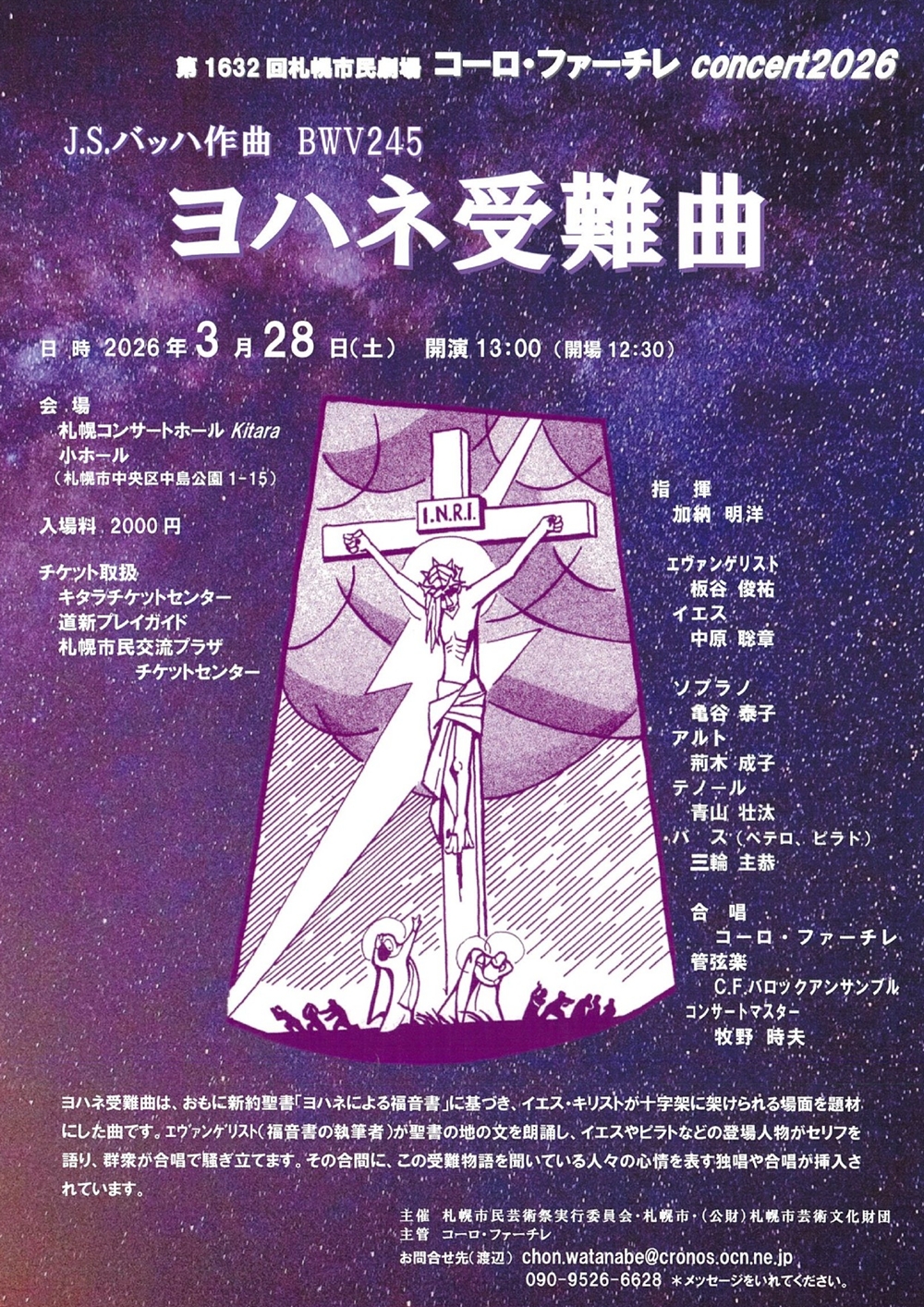 第1632回札幌市民劇場コーロ・ファーチレ concert2026 3月28日(土)13:00 札幌コンサートホールKitara小ホール 出演 指揮/加納 明洋 エヴァンゲリスト/板谷 俊祐 イエス/中原 聡章 ソプラノ/亀谷 泰子 アルト/荊木 成子 テノール/青山 壮汰 バス(ペテロ、ピラド)/三輪 主恭 合唱/コーロ・ファーチレ 管弦楽/C.F.バロックアンサンブル コンサートマスター/牧野 時夫(北海道農民管弦楽団代表) 演目 J.S.バッハ/ヨハネ受難曲BWV245 |