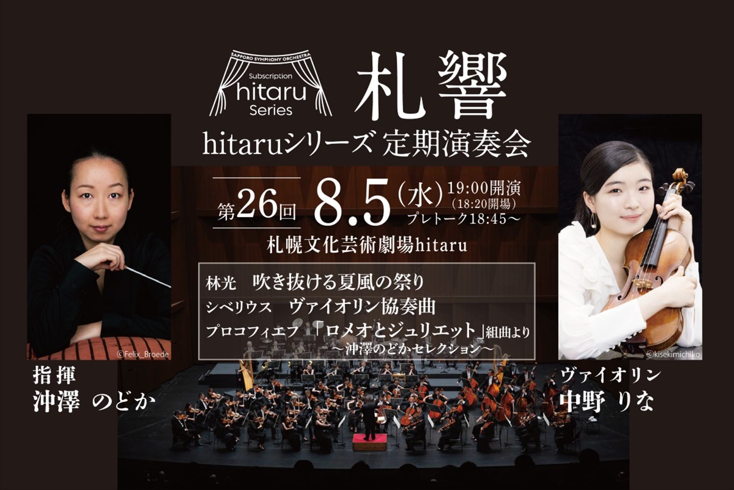 札幌交響楽団hitaruシリーズ定期演奏会第26回 8月5日(水)19:00 札幌文化芸術劇場hitaru(札幌市中央区北1条西1丁目札幌市民交流プラザ4階) 出演 指揮/沖澤のどか ヴァイオリン/中野 りな 曲目 林光/吹き抜ける夏風の祭り シベリウス/ヴァイオリン協奏曲 プロコフィエフ/「ロミオとジュリエット」組曲より~沖澤のどかセレクション~ |