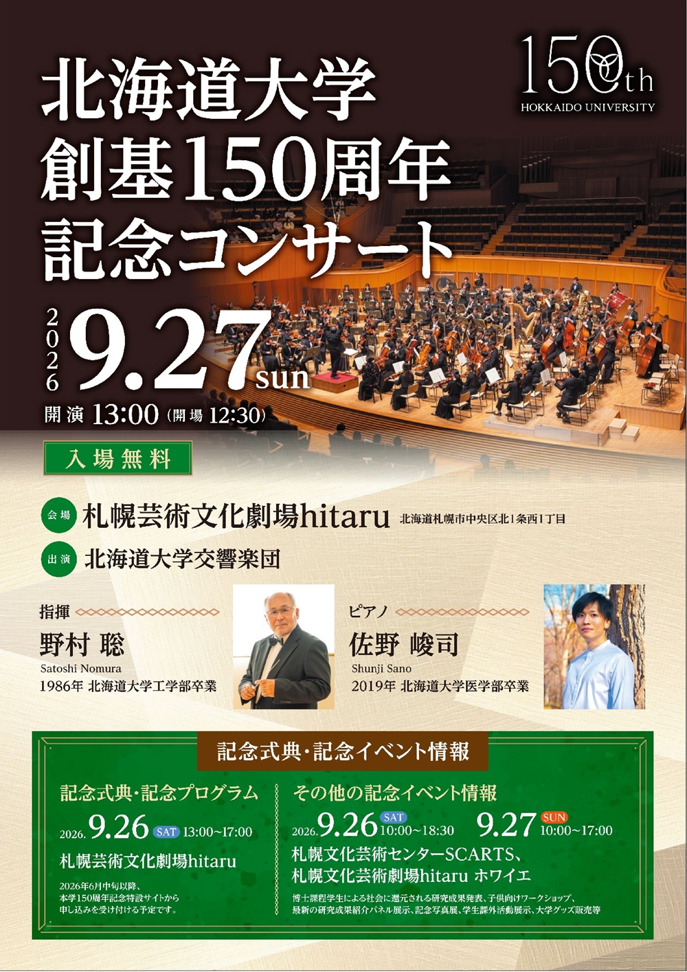 北海道大学創基150周年記念コンサート 9月27日(日)13:00 札幌芸術文化劇場hitaru(札幌市中央区北1条西1丁目札幌市民交流プラザ4階) 出演 指揮/野村 聡(1986年北海道大学工学部卒業) ピアノ/佐野 俊司(2019年北海道大学医学部卒業) 管弦楽/北海道大学交響楽団 曲目 発表されておりません。 |