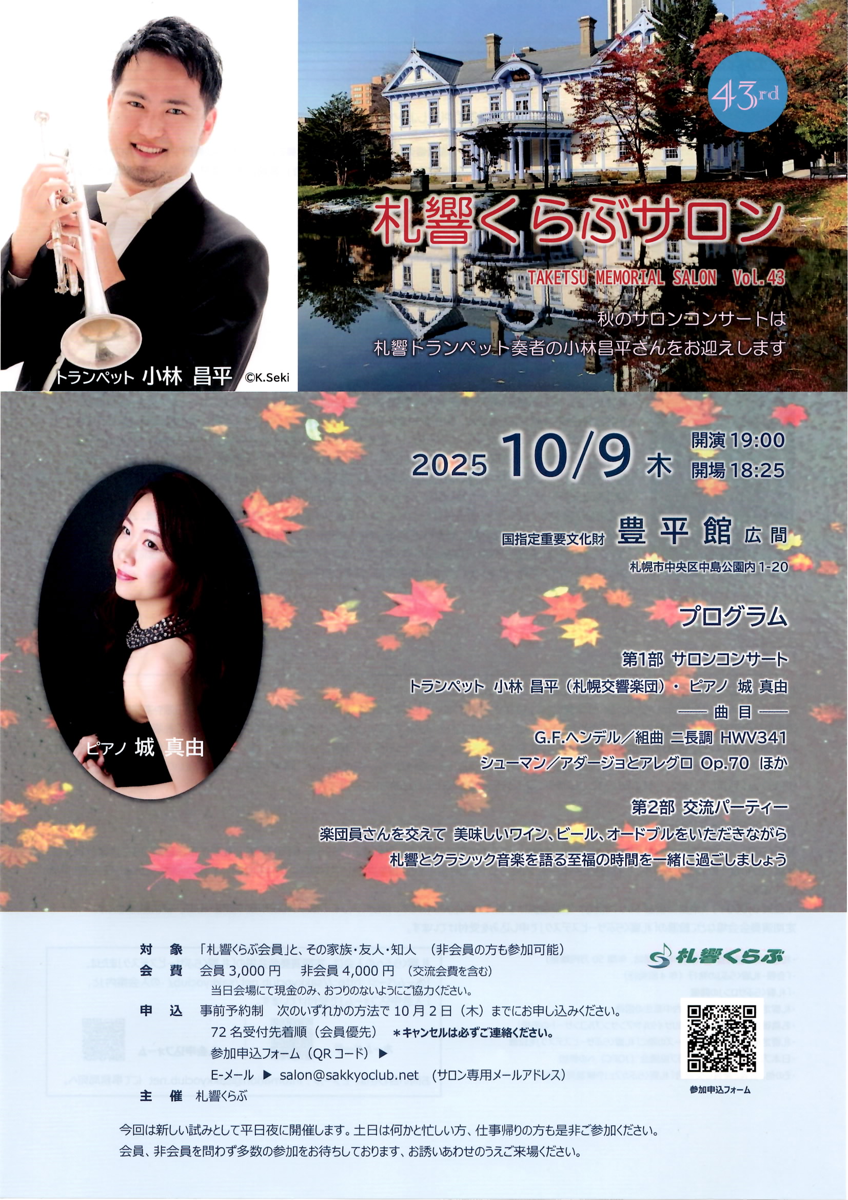| 2026/01/12(月・祝) | 第43回札響くらぶサロン開催のお知らせ (12/01) 1月12日(月・祝)18:15 国指定重要文化財「豊平館」広間(札幌市中央区中島公園1-20) 参加対象:原則として「札響くらぶ会員」及びその家族・友人・知人(非会員の方も参加 可能) 会費:会員 3,000円、非会員4,000円 申込:事前予約制、次のいずれかの方法で1月5日までにお申し込みください。 参加申込フォーム(右上のチラシ画像クリックしてQRコードを読み込んでください。) Eメール:salon@sakkyoclub.net(札響くらぶサロン専用メール) プログラム 第1部 札幌定期演奏会のプレトーク 出演:八木 幸三(札響くらぶ顧問、札幌音楽会協議会会長) 第2部 ニューイヤー・サロンコンサート 出演:ヴィオラ/原 香奈恵(札響ヴィオラ奏者) ピアノ/城 真由 曲目:ヤン・ヴァーツラフ・カリヴァダ/6つのノクターンOp.186より第1番、 第2番、第4番 セザール・フランク/ヴァイオりイン・ソナタイ長調FWV8(ヴィオラ版) …他 第3部 ニューイヤー・交流パーティー 美味しいオードブルとワイン、ビールなどで楽しい時間をお過ごしください。 |