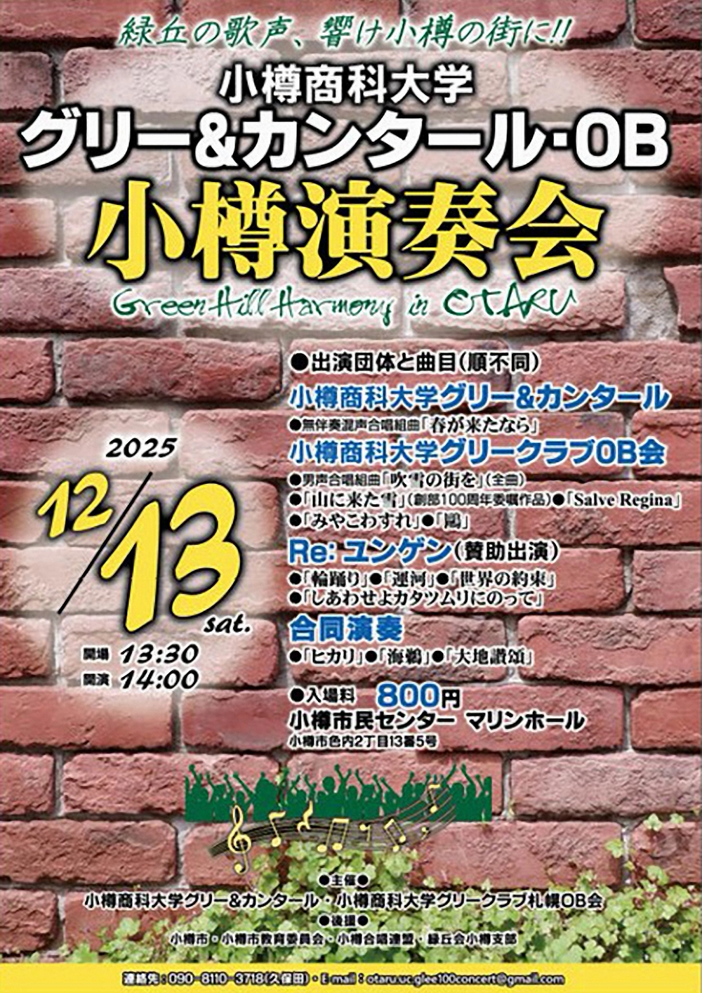 小樽商科大学グリー&カンタール・OB 小樽演奏会 Green Hill Harmony in OTARU 緑丘の歌声、響け小樽の街に!! 12月13日(土)14:00 小樽市民センターマリンホール(小樽市色内2丁目13-5) 出演団体と曲目(順不同) 〇小樽署科大学グリー&カンタール 山下祐加/無伴奏合唱組曲「春が来たなら」 〇小樽署科大学グリークラブOB会 多田武彦/男声合唱組曲「吹雪の街を」(全曲) 作曲不詳・作詞武笠三/「山に来た雪」(創部100周年委嘱作品) ヘルマス・コントラクトゥス/「Salve Regina」 千原英喜/「みやこわすれ」 作曲木下牧子・作詞三好達治/「鴎」 〇Re:ユンゲン(賛助出演) 南 弘明/「輪踊り」 弦 哲也/「運河」 作曲木村弓・歌谷川俊太郎詞/映画『ハウルの動く城』主題歌「世界の約束」 信長貴富/「しあわせよカタツムリにのって」 〇合同演奏 作曲松下耕・作詞瀬戸沙織/「ヒカリ」 作曲不詳・作詞宮原晃一郎/「海鴉」 作曲佐藤眞・作詞大木惇夫/「大地讃頌」 |