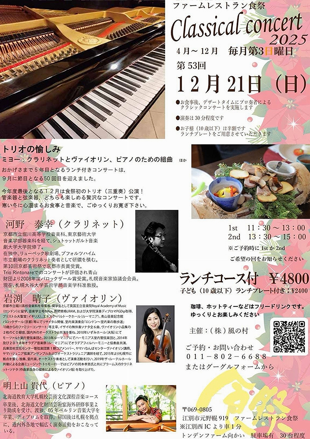 ファームレストラン食祭第53回Classical concert 2025 トリオの愉しみ 12月21日(日)1st 11:30~13:00 2nd 13:30~15:00 ファームレストラン食祭(江別市元野幌919) 出演 クラリネット/河野 泰幸(札幌大谷大学芸術学部音楽学科准教授) ヴァイオリン/岩渕 晴子(フリーランスヴァイオリニスト) ピアノ/明上山貴代(フリーランスピアニスト) 曲目 ミヨー/クラリネットとヴァイオリン、ピアノのための組曲 ほか |