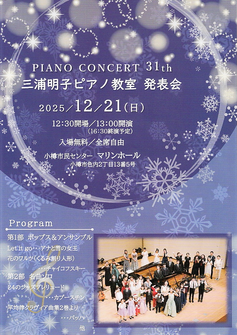 PIANO CONCERT 31th三浦明子ピアノ教室発表会 12月21日(日)13:00 小樽市民センターマリンホール(小樽市色内2丁目13-5) 出演 三浦明子ピアノ教室受講生徒 Program 第1部 ポップス&アンサンブル クリステン・アンダーソン=ロペスとロバート・ロペス/Let it go・・・アナと雪の女王 チャイコフスキー/バレエ『くるみ割り人形』より「花のワルツ」 第2部 名曲ソロ カプースチン/24のジャズプレリュード バッハ/平均律クラヴィア曲集第2巻より ……他 |