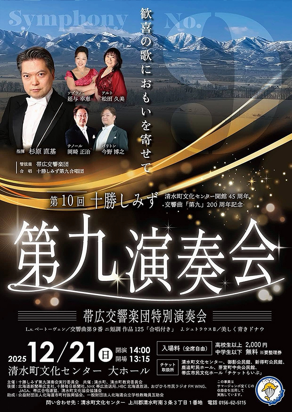 清水町文化センタ開館45周年交響曲「第九」200周年記念 第10回十勝しみず 第九演奏会 帯広交響楽団特別演奏会 12月21日(日)14;00 清水町文化センター大ホール(上川郡清水町南3条3丁目1番地) 出演 指揮/杉原 直基 ソプラノ/延与 幸恵 アルト/松田 久美 テノール/岡崎 正治 バリトン/今野 博之 管弦楽/帯広交響楽団 合唱/十勝しみず第九合唱団 曲目 J.シュトラウス/美しく青きドナウ L.v.ベートーヴェン/交響曲第9番ニ短調作品125「合唱付き |