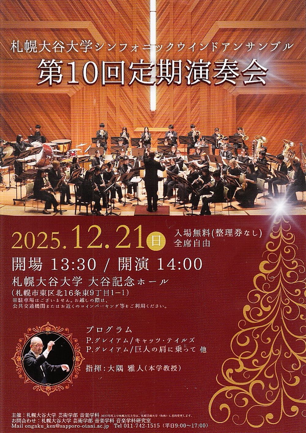 札幌大谷大学シンフォニックウインドアンサンブル 第10回定期演奏会 12月21日(日)14:00 札幌大谷大学大谷記念ホール(札幌市東区北16条東9丁目1-1) 出演 指揮/大隅 雅人(札幌大谷大学教授) 吹奏楽/札幌大谷大学シンフォニックウインドアンサンブル プログラム P.グレイアム/キャッツ・テイルズ P.グレイアム/巨人の肩に乗って ……他 |