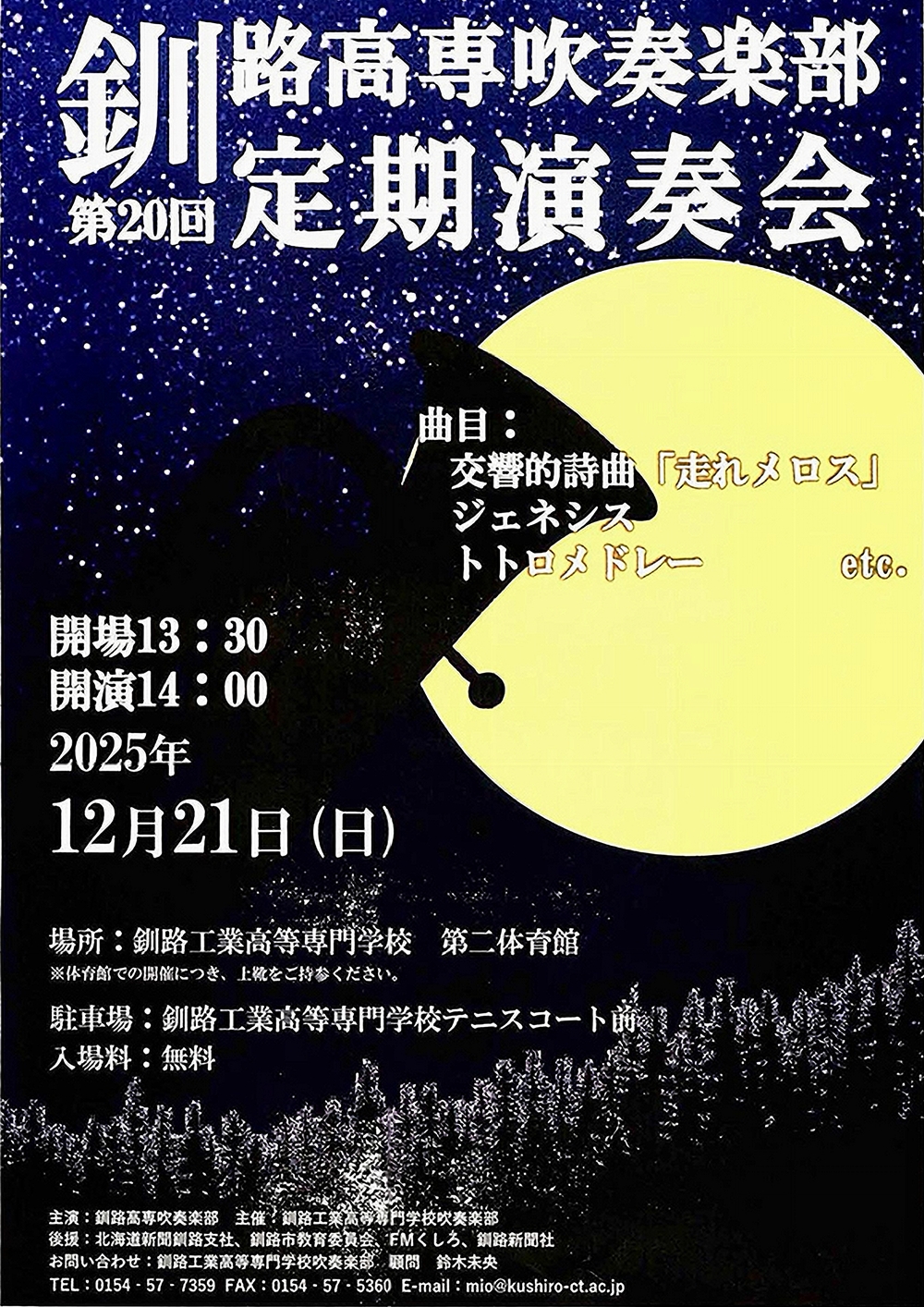 釧路高専吹奏楽部第20回定期演奏会 12月21日(日)14:00 釧路工業高等専門学校第二体育館(釧路市大楽毛西2丁目32-1) 出演 吹奏楽/釧路工業高等専門学校吹奏楽部 曲目 福島弘和/交響的詩曲「走れメロス」 ジョナサン・キング/ジュネシス 久石譲/トトロメドレー ……etc. |