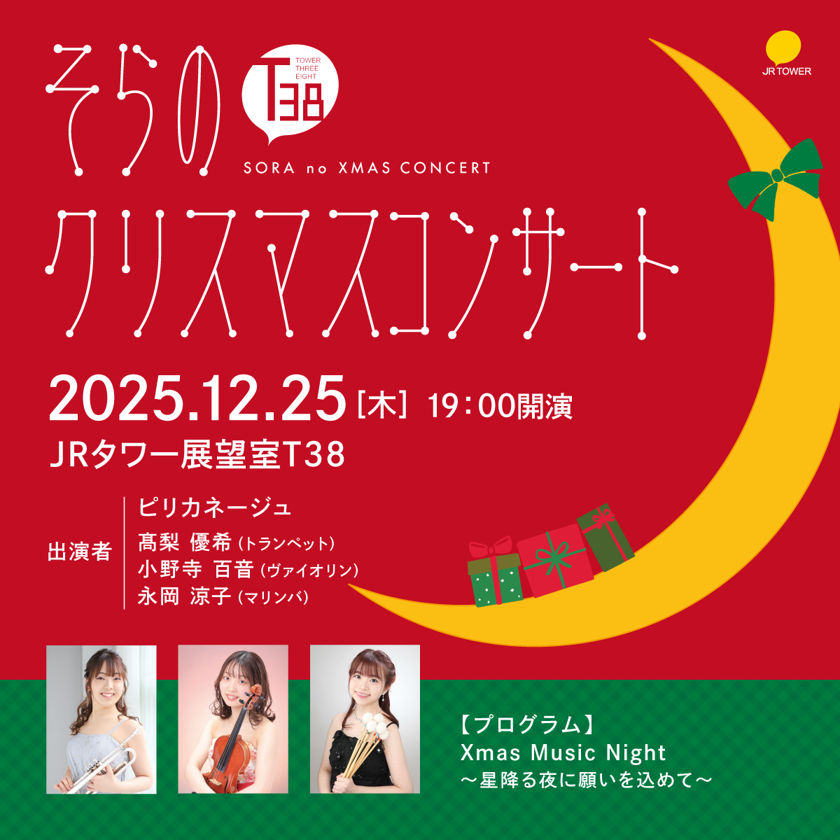 TOWER THREE EIGHTそらのクリスマスコンサート SDPA no XMAS CONCERT 12月25日(木)19:00 JRタワー展望室T38(札幌市中央区北5条西2丁目5番地) 出演 ピリカネージュ トランペット/髙梨 優希(プロウインドオーケストラ北海道トランペット奏者) ヴァイオリン/小野寺百音 マリンバ/永岡涼子(プロウインドオーケストラ北海道打楽器奏者) プログラム・テーマ Xmas Music Night~星降る夜に願いを込めて? ルロイ・アンダーソン/そりすべり トミー・コーナー/ママがサンタにキッスした 小林亜星/あわてんぼうのサンタクロース アーヴィング・バーリン/ホワイト・クリスマス ジョニーマークス/赤鼻のトナカイ 山下達郎/クリスマス・イブ フレッド・クーツ/サンタが町にやってくる リー・ハーライン/星に願いを 「くるみ割り人形」/組曲「くるみ割り人形」メドレー 小林亜星/ハッピークリスマスメドレー |