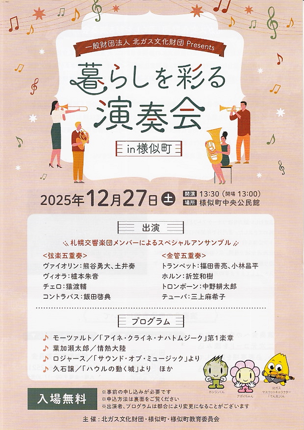 北ガス文化財団Presents暮らしを彩る音楽会 in 様似町 12月27日(土)13:30 様似町中央公民館(様似群様似町大通1丁目21) 出演 札幌交響楽団メンバーによるスペシャルアンサンブル 曲目 <弦楽五重奏> ヴァイオリン/熊谷 勇太 ヴァイオリン/土井 奏 ヴィオラ/櫨本 朱音 チェロ/猿渡 輔 コントラバス/飯田 啓典 <金管五重奏> トランペット/福田 善亮 トランペット/小林 昌平 ホルン/折笠 和樹 トロンボーン/中野耕太郎 テューバ/三上麻希子 曲目 モーツァルト/「アイネ・クライネ・ナハトムジーク」第1楽章 葉加瀬太郎/情熱大陸 ロジャース/映画「サウンド・オブ・ミュージック」より 久石譲/映画「ハウルの動く城」より …ほか |