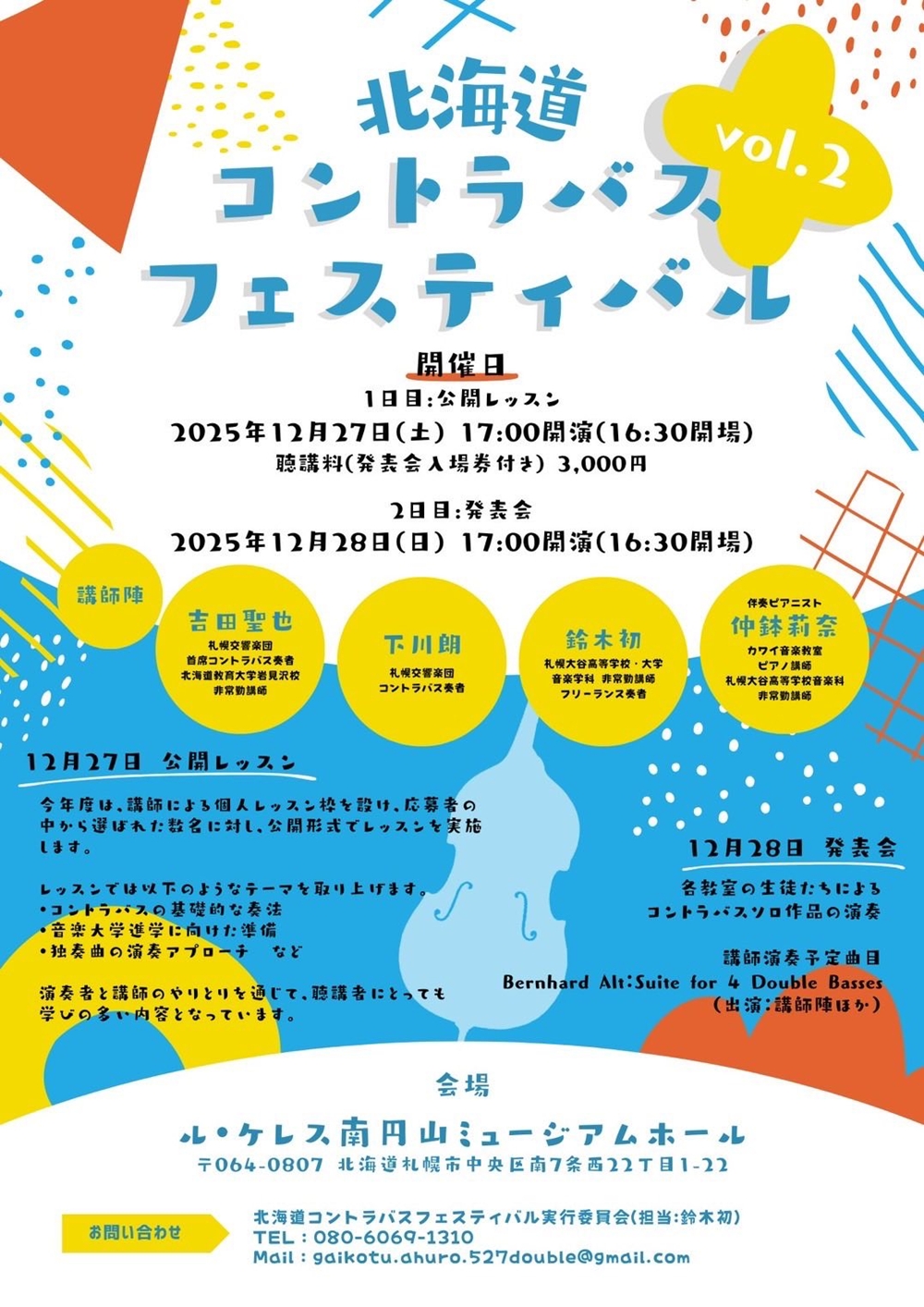 北海道コントラバスフェスティバル 12月27日(土)・28日(日)各17:00 ル・ケレス南円山ミュージアムホール(札幌市中央区南7条西22丁目1-22) 出演 講師陣 吉田 聖也(札響コントラバス首席奏者) 下川 朗(札響コントラバス奏者) 鈴木 初(フリーランス奏者。札幌大谷大・高校音楽科非常勤講師) 中鉢 莉奈(伴奏ピアニスト。カワイ音楽教室ピアノ講師) プログラム 12月27日 公開レッスン ・コントラバスの基礎的な奏法 ・音楽大学進学に向けた準備 ・独奏曲の演奏アプローチ ……など 12月28日 発表会 各教室の生徒たちによるコントラバスソロ作品の演奏 講師演奏予定曲目 ベルンハルト・アルト/組曲「ストリングベース四重奏」 |