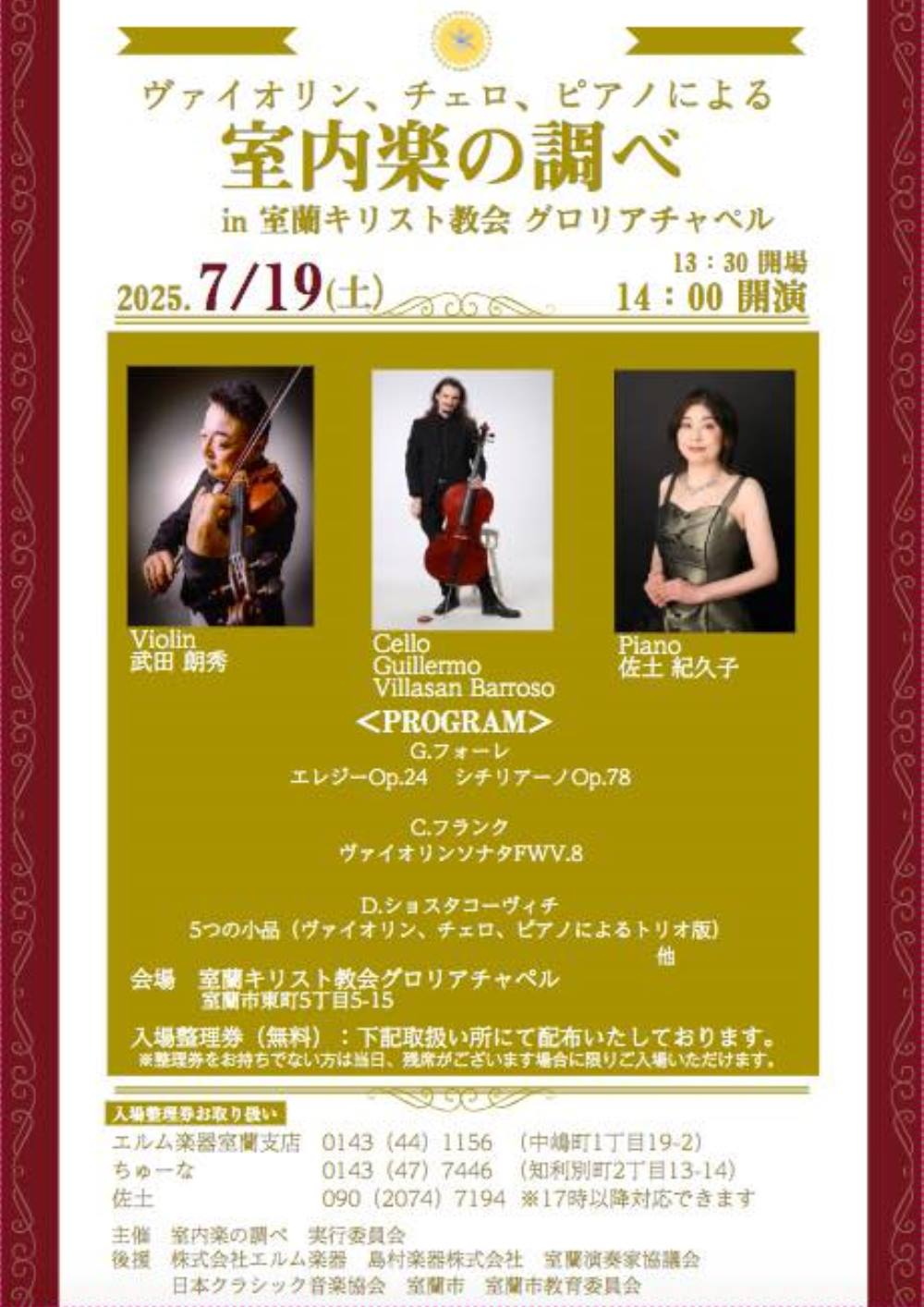 ヴァイオリン、チェロ、ピアノによる室内楽の調べ in 室蘭キリスト教会グロリアチャペル 7月19日(土)14:00 出演 ヴァイオリン/武田 朗秀 チェロ/Guillermo Villasan Barroso(ビジャサン・バローソ・ギジェルモ) ピアノ/佐土紀久子 曲目 フォーレ/エレジーOp24 シチリアーノOp78 C.フランク/ヴァイオリン・ソナタFWV.8 D.ショスタコーヴィチ/5つの小品(ヴァイオリン、チェロ、ピアノによ折るトリオ版) ・・・他 |