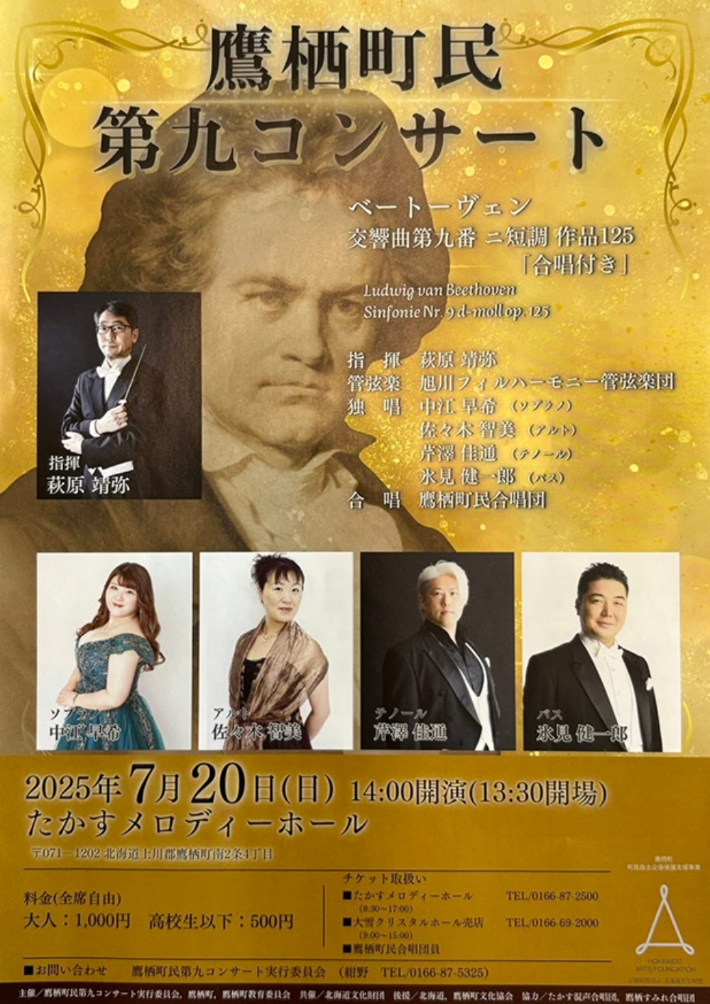 鷹栖町民第九コンサート 7月20日(日)14:00 出演 指揮/萩原 靖弥(トロンボーン奏者。札幌管楽ゾリステン メンバー) ソプラノ/中江 早希(鷹栖町ふるさと応援大使) アルト/佐々木智美(オペラソリスト) テノール/芹澤 佳通(東京二期会会員) バス/氷見健一郎(BCJバッハ・コレギウム・ジャパン声楽メンバー) 管弦楽/旭川フィルハーモニー管弦楽団 合唱/鷹栖町民合唱団 曲目 ベートーヴェン/交響曲第九番作品125「合唱付き」 |