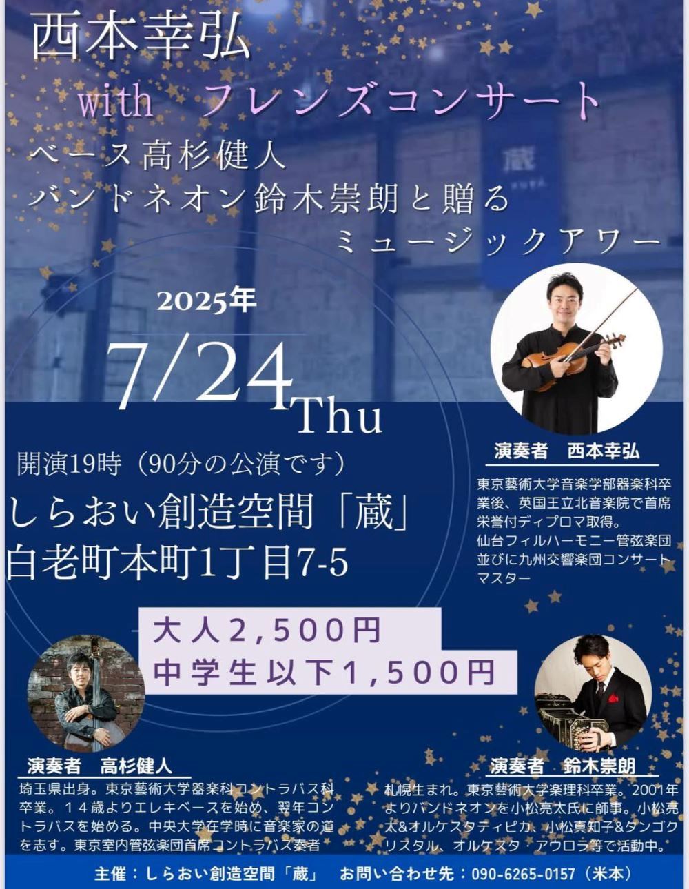 西本幸弘with フレンズコンサート ベース高杉健人 バンドネオン鈴木崇朗と贈る ミュージックアワー 7月24日(木)19:00~20:30 しらおい創造空間「蔵」(白老郡白老町本町1丁目7-5) 出演 ヴァイオリン/西本 幸弘(仙台フィルコンサートマスター) コントラバス/高杉 健人(東京室内管弦楽団コントラバス首席奏者) バンドネオン/鈴木 崇朗(小松亮太&オルケスタティピカ等で活躍) 曲目 発表されておりません。 当日の演奏をお楽しみください。 |