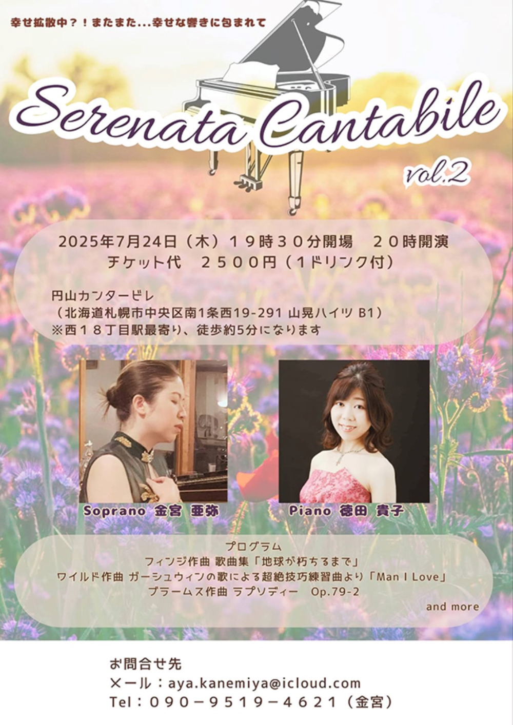 Serenata Cantabile Vol.27月24日(木)20:00 円山カンタービレ(札幌市中央区南1条西19丁目291三晃ハイツB1) 出演 ソプラノ/金宮 亜弥 ピアノ/徳田 貴子 プログラム フィンジ/歌曲集「地球が朽ちるまで」 ワイルド/『ガーシュインの歌による超絶技巧練習曲』より「Man I Love」 ブラームス/ラプソディーOp.79-2 |