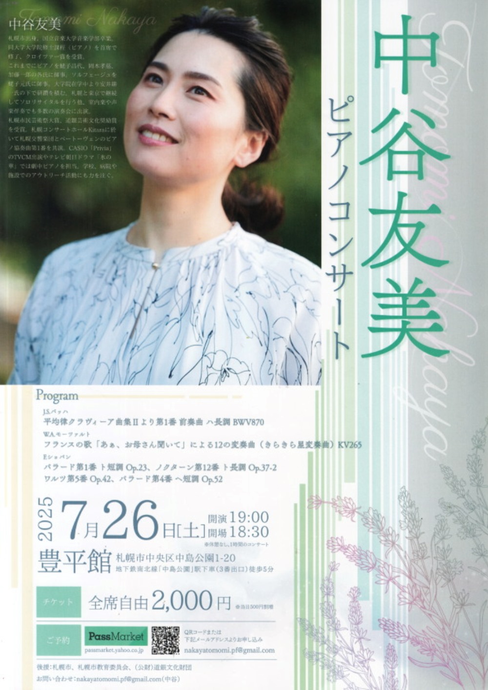 ピアノコンサート 7月26日(土)19:00 札幌市豊平館(札幌市中央区中島公園1-20) 出演 ピアノ/中谷 友美 曲目 J.S.バッハ/平均律クラヴィーア曲集Ⅱより第1番前奏曲ハ長調BWV870 W.A.モーツァルト/フランスの歌「あぁ、お母さんに聞いて」による12の変奏曲(きらきら星変奏曲KV265 F.ショパン/バラード第1番ト短調Op.23 F.ショパン/ノクターン第12番ト長調Op.37-2 F.ショパン/ワルツ第5番Op.42 F.ショパン/バラード第4番ヘ短調Op.52 |