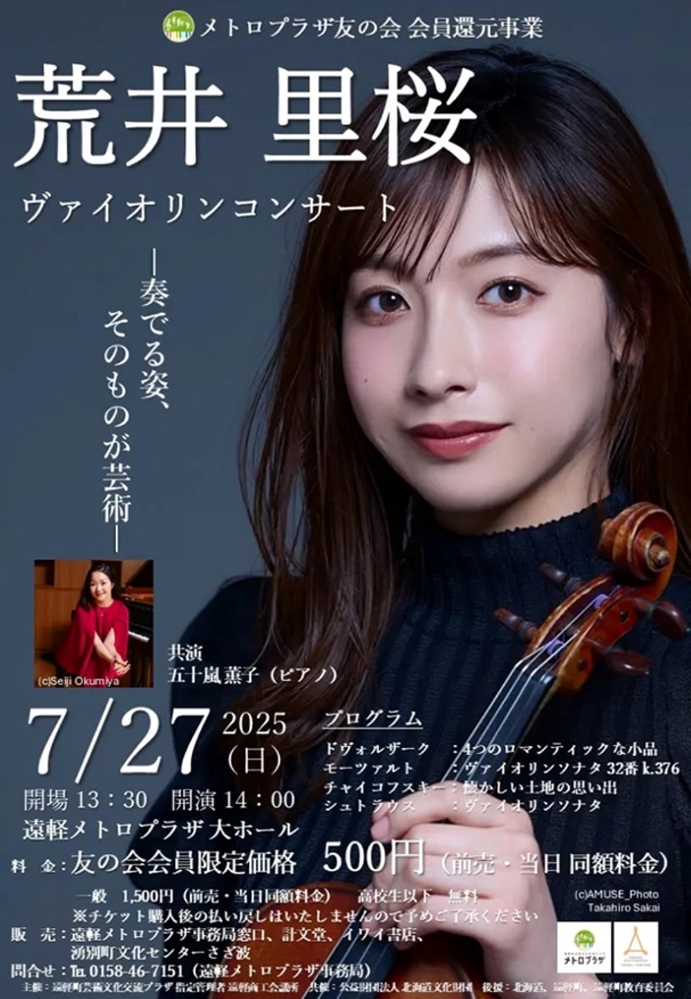 メトロプラザ友の会会員還元事業荒井里桜 ヴァイオリンコンサート ―奏でる姿、そのものが芸術― 7月27日(日)14:00 遠軽メトロプラザ大ホール(紋別郡遠軽町岩見通南1丁目) 出演 ヴァイオリン/荒井 里桜(アミューズクリエイティブスタジオ所属) ピアノ/五十嵐薫子(TOPPAN HALLアーティスト) 曲目 ドヴォルザーク/4つのロマンティックな小品 モーツァルト/ヴァイオリンソナタ第32番K.376 チャイコフスキー/懐かしい土地の思い出 シュトラウス/ヴァイオリンソナタ |